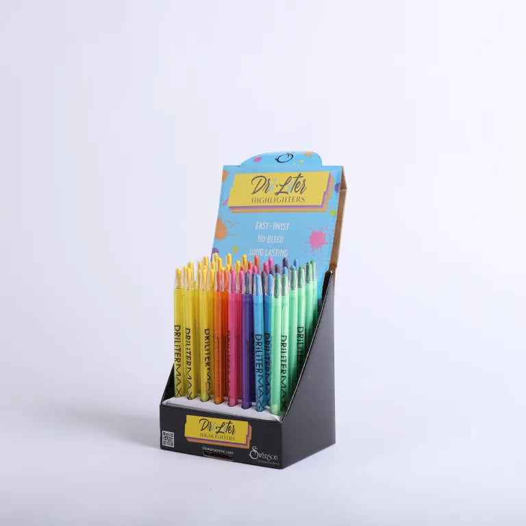 Each pack includes a variety of colors to suit your highlighting needs: 18 Yellow, 6 Green, 6 Blue, 6 Purple, 6 Pink, and 6 Orange. With the easy-twist function, you can ensure you get the most out of every Dri-Liter. The opacity of the highlight is controlled by how hard you press and how many times you highlight, giving you the flexibility to create the perfect effect.