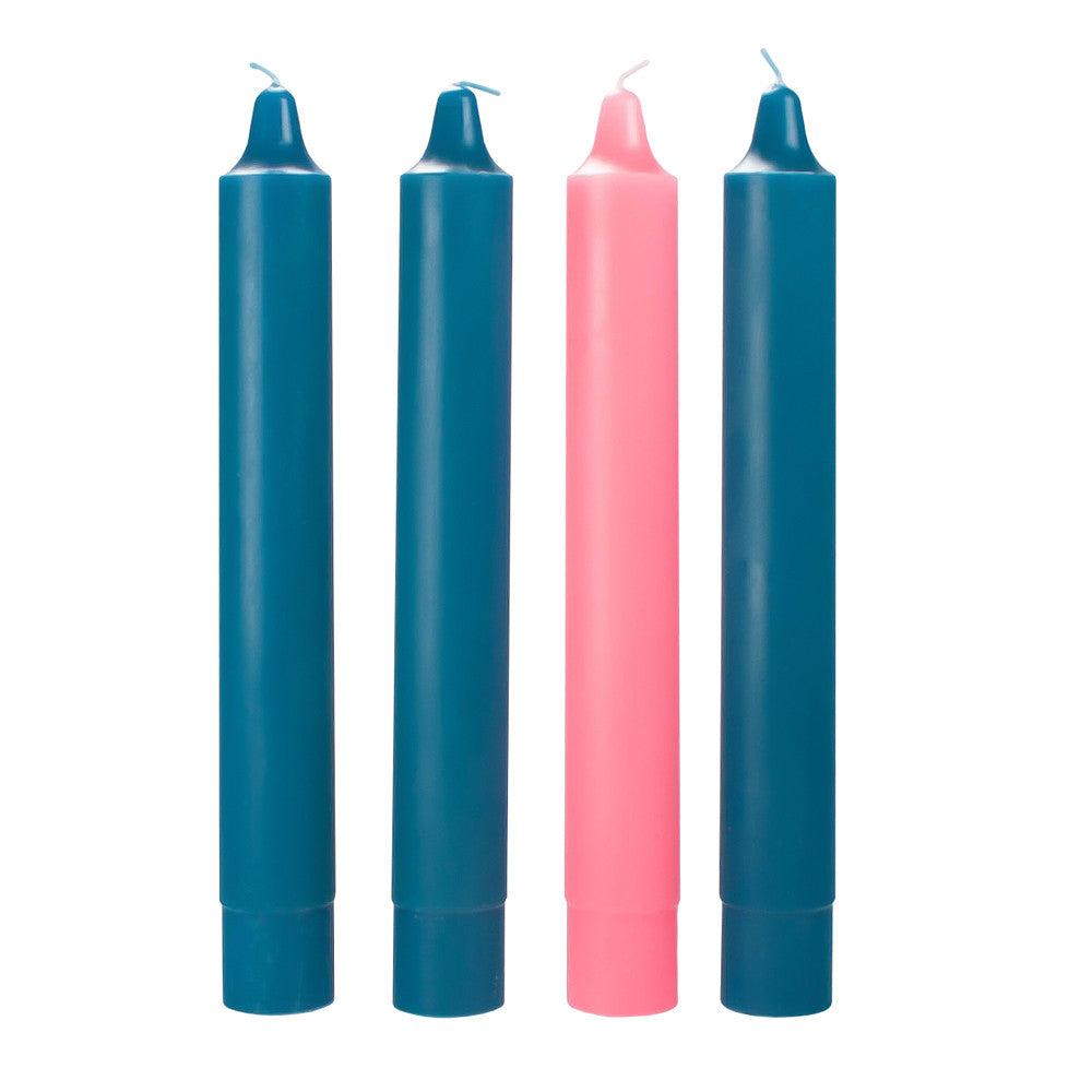 This set includes 3 Blue and 1 pink candle