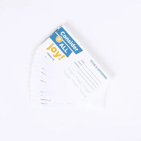 Front Design: “Tithe/Offering”. A fun and colorful design, featuring bold blue and yellow and James 1:2, plus write-in slots for name, date, and address, and slots for offering type and amount.