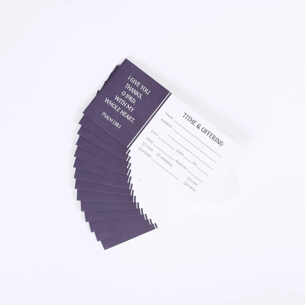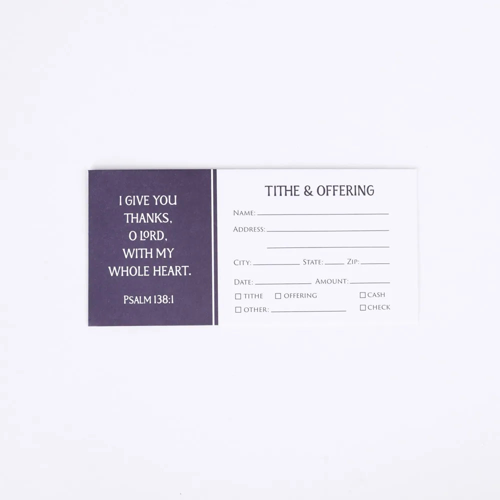 Front Design: “Tithe & Offering”. A simple and elegant design, featuring psalm 138:1, plus write-in slots for name, date, and address, and amount.