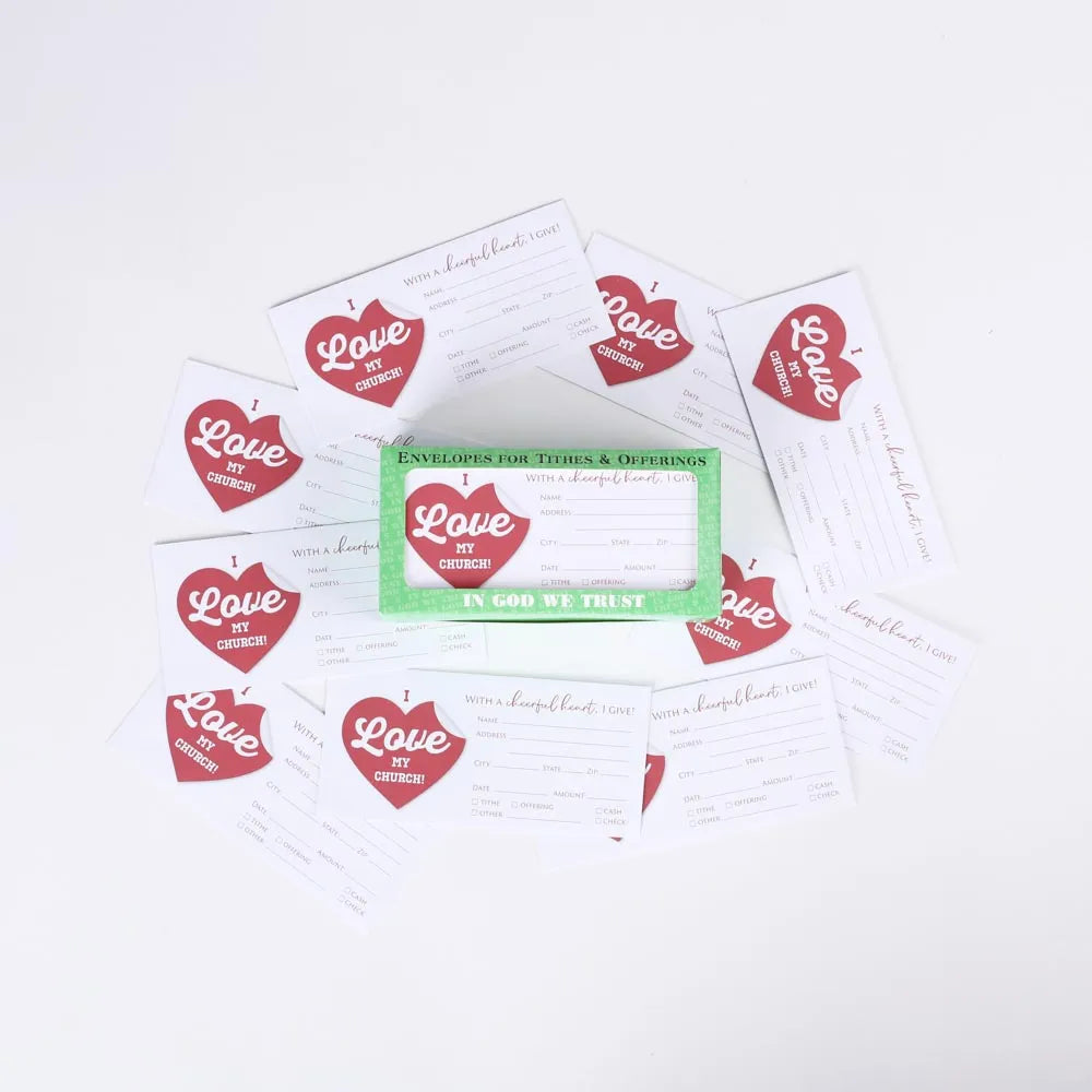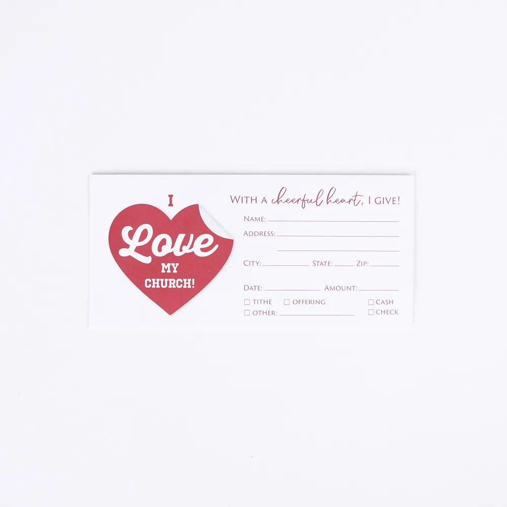 Front Design: “With a Cheerful Heart I Give:” A simple and stylish design featuring a bold red heart and a message of “I Love My Church,” plus write-in slots for name, address, date, and amount, with a checklist for offering type.