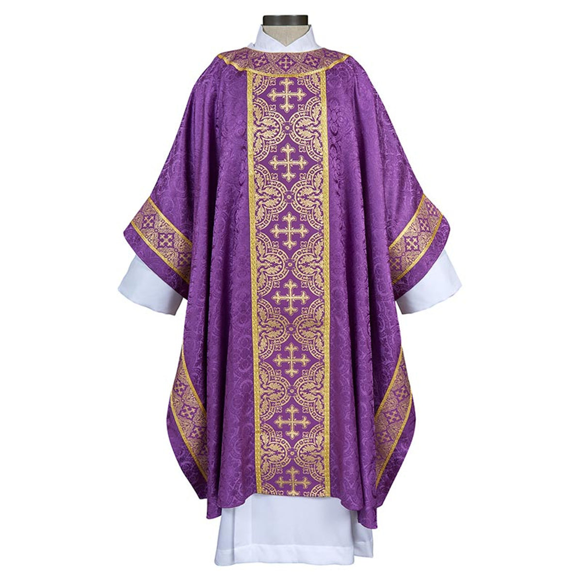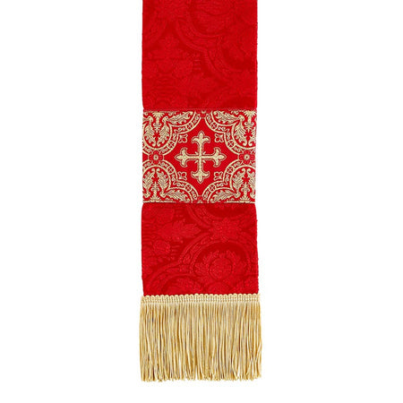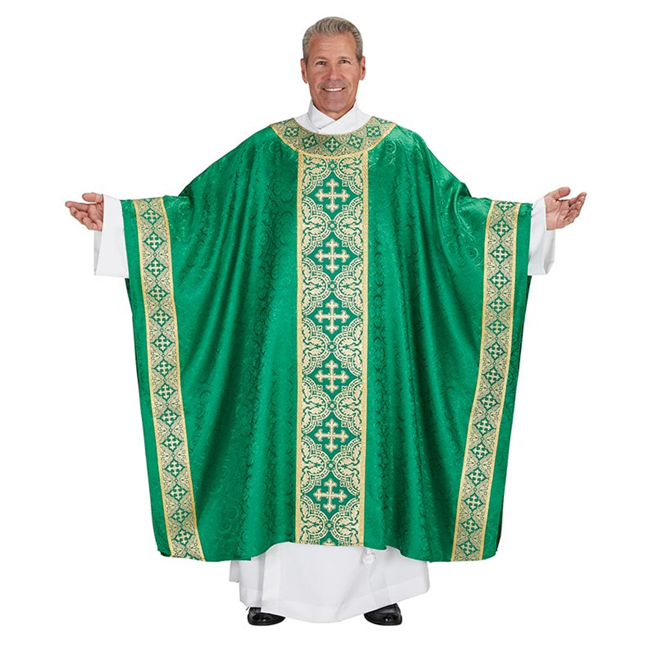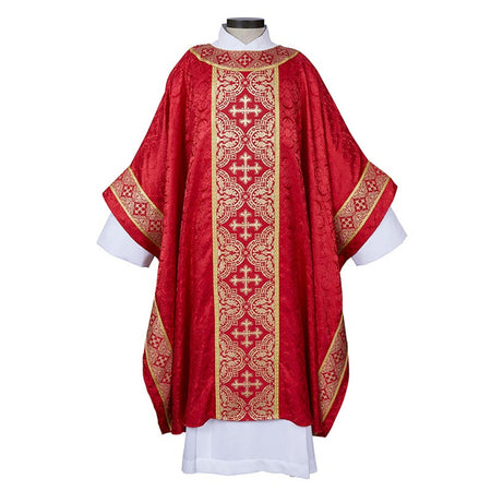 The Excelsis Chasuble is crafted with beautiful Avignon Jacquard fabric. The exclusive design gold banding orphrey is adorned with matching gold lace in a Monastic style with banded round neck.