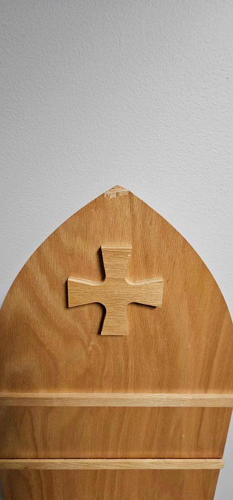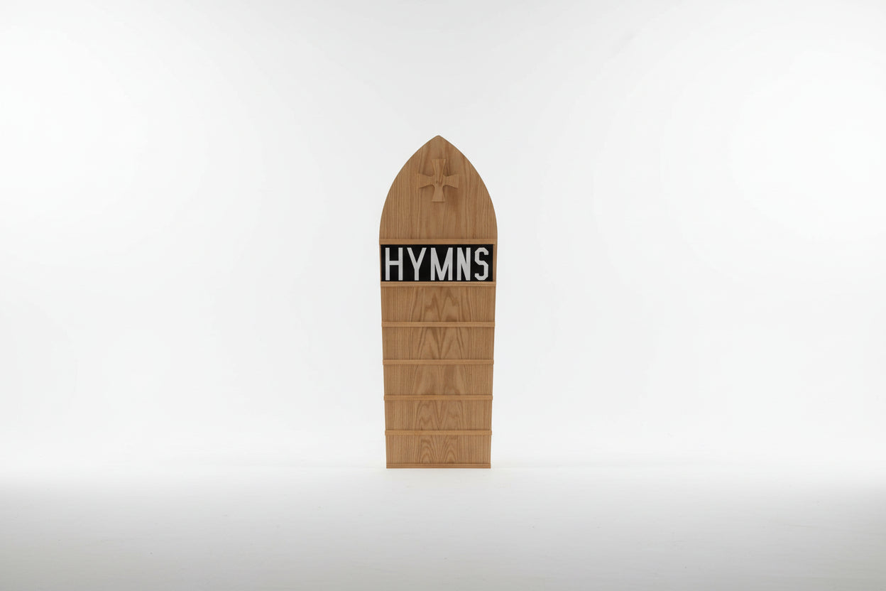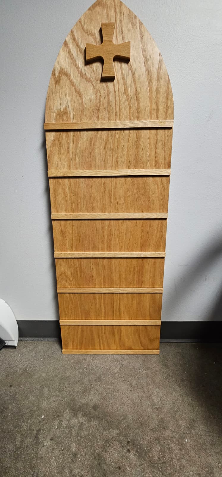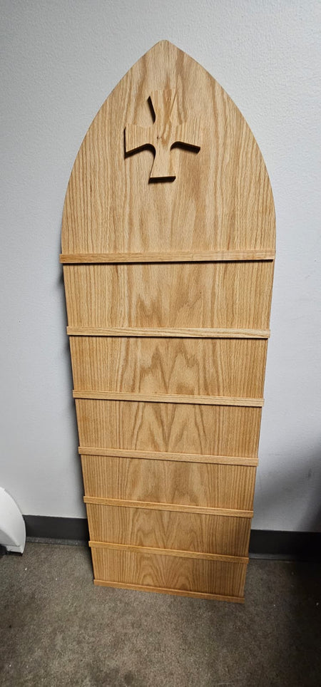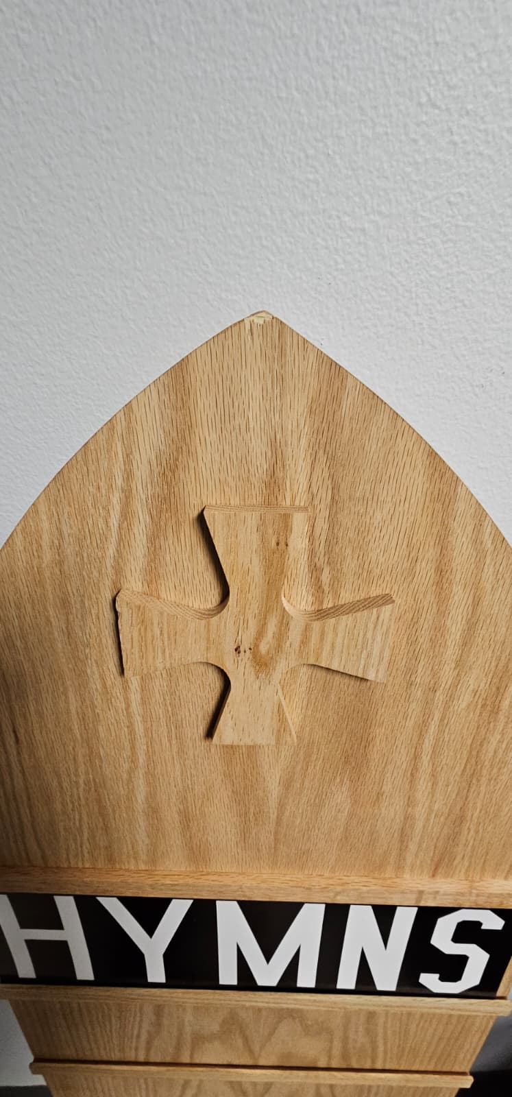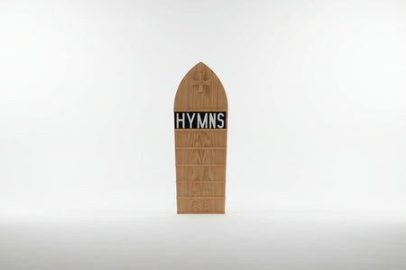 This classically styled wall mounted hymn board is made of cabinet-grade oak veneer plywood, so it won't crack or warp. Hymn board features a raised oak cross, 6 rows of slotted shelves to hold cardstock hymn slides. Holds cardboard hymn slides that are 5-1/4" tall 15-1/2" wide x 46-1/2" tall Weighs 14 lbs. Includes a Hymns slide. Number sets sold separately.