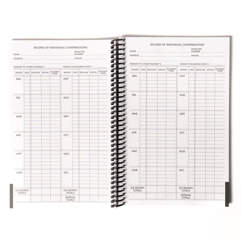 This comb-bound book (5 3/16" x 9") contains sufficient forms for churches of approximately 150 members for one year. It includes forms for church receipts, record of members' contributions, and disbursements.