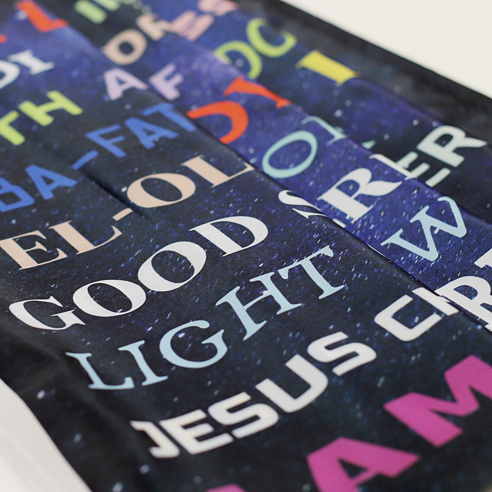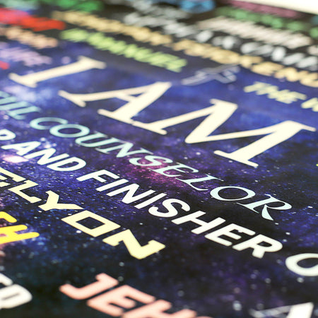 The message it features is designed to inspire and uplift, reminding us of all of the powerful and meaningful names of God and who He is. The bright starry background in infused with color, and overlaid are many of the Names of God featured in bright colors, making it a great addition to any home, office, or place of worship. Also featured is a timeless, vintage design, making it an elegant and meaningful addition to any collection.