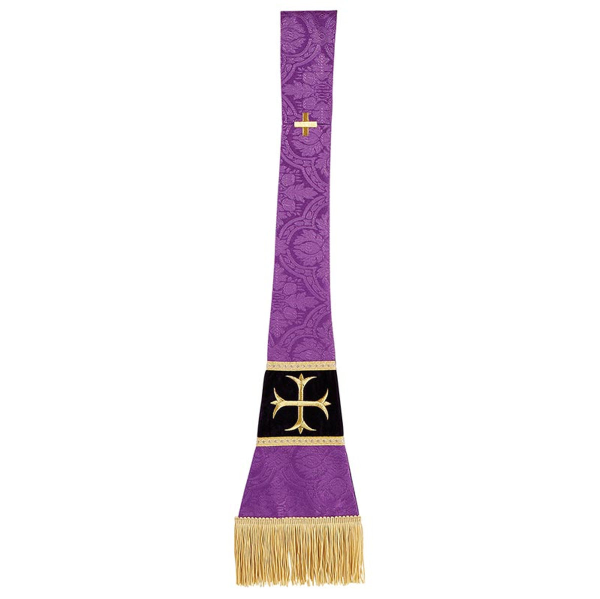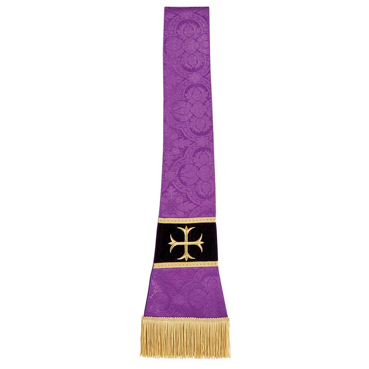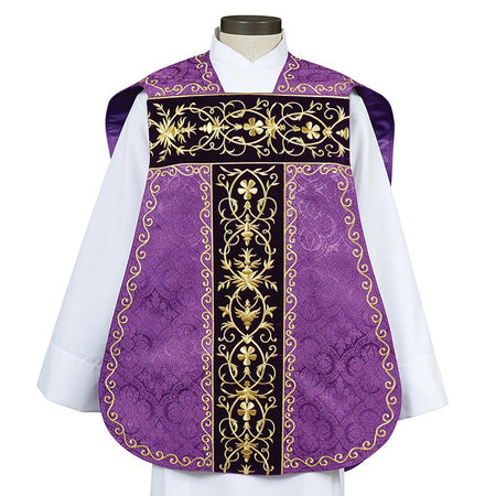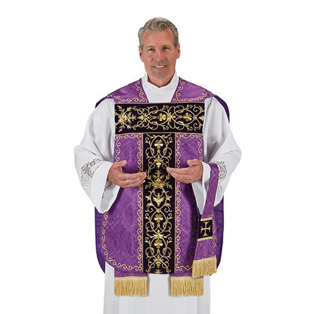 Classic fiddle back chasuble comes complete with matching inner stole, maniple, chalice veil and burse richly embroidered velvet banding finished with gold trim and matching fringe.