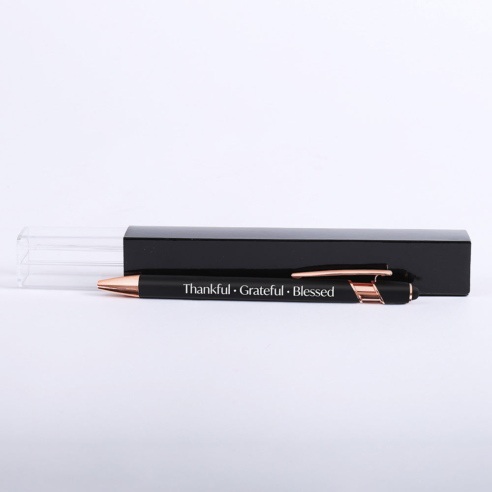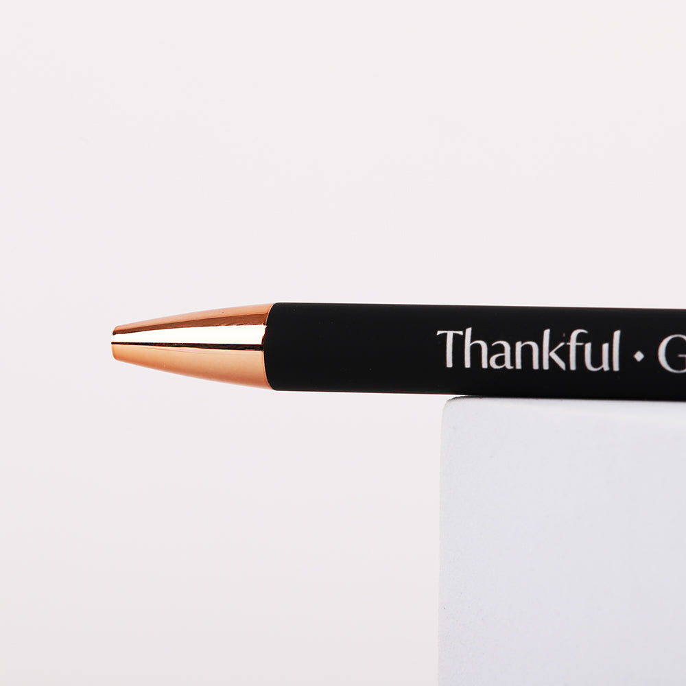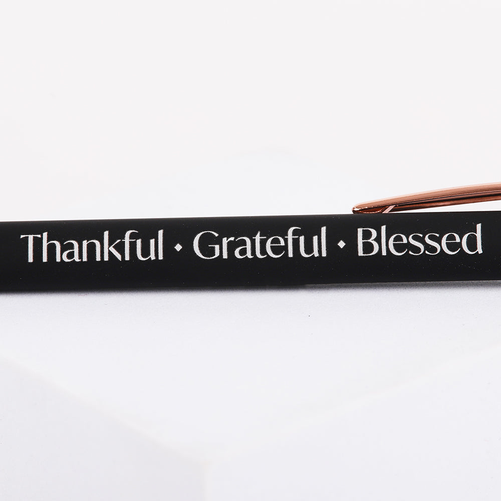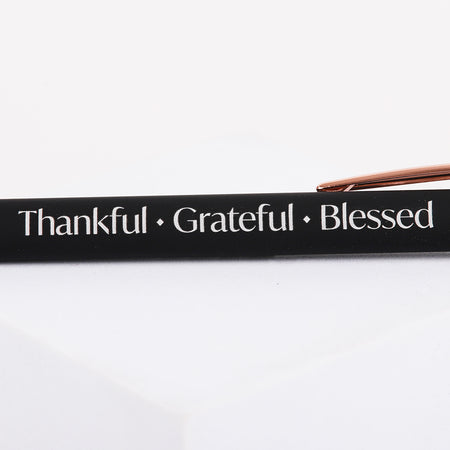 But what makes this pen truly special is that it’s designed for the Thankful, the Grateful, and the Blessed. So, why not give a gift that’s an encouraging reminder to others or yourself? Our pen features a bold grey base with rose gold accents and a smooth engraved design that reads “Thankful, Grateful, Blessed”, creating a stylish and sophisticated look that’s sure to impress.