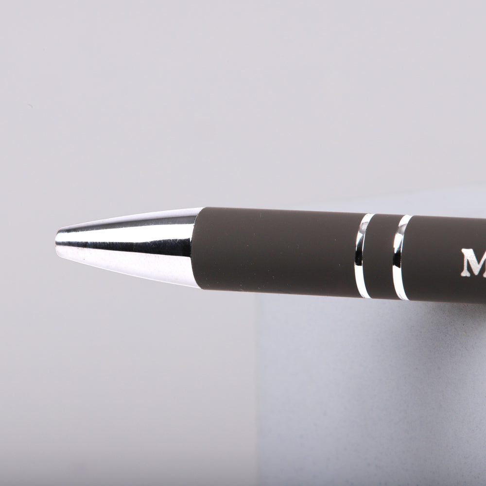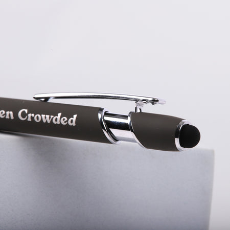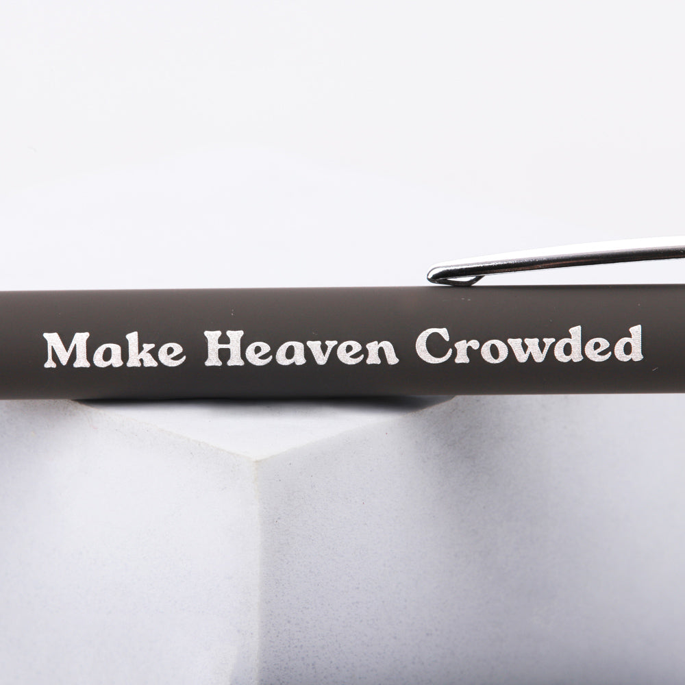This sleek grey soft-touch gift pen offers both style and functionality. With a smooth ballpoint for easy writing and a built-in stylus tip, it’s perfect for smartphones, tablets, and other touchscreens. The pen’s soft-touch finish ensures a comfortable grip for prolonged use, while the striking silver inscription of “Make Heaven Crowded” offers a daily reminder of purpose and faith. Whether you’re taking notes, signing documents, or navigating your device, this pen provides inspiration with every use. It makes a thoughtful gift for anyone passionate about spreading faith and serving others, ideal for birthdays, holidays, or just because. With its modern design and powerful message, this pen is not only a practical writing tool but a meaningful keepsake that encourages the wearer to stay focused on their calling. The elegant design and uplifting message make it a cherished gift for anyone who desires to share the love of Christ and make a positive impact. This pen serves as a constant reminder that every action counts and can help make heaven crowded. Perfect for daily use, it will inspire faith and purpose each time it’s used.