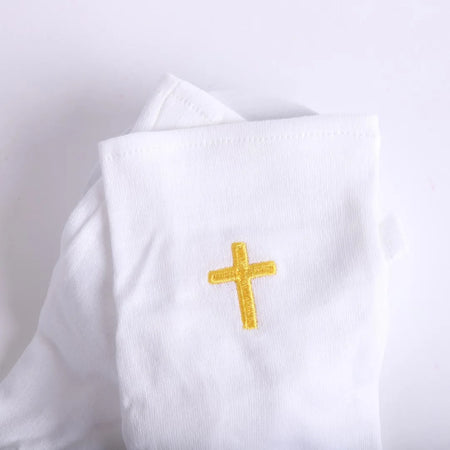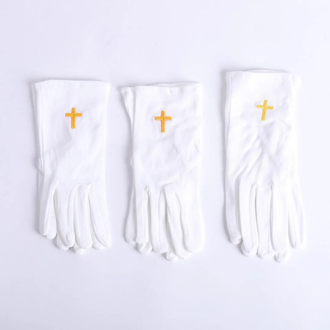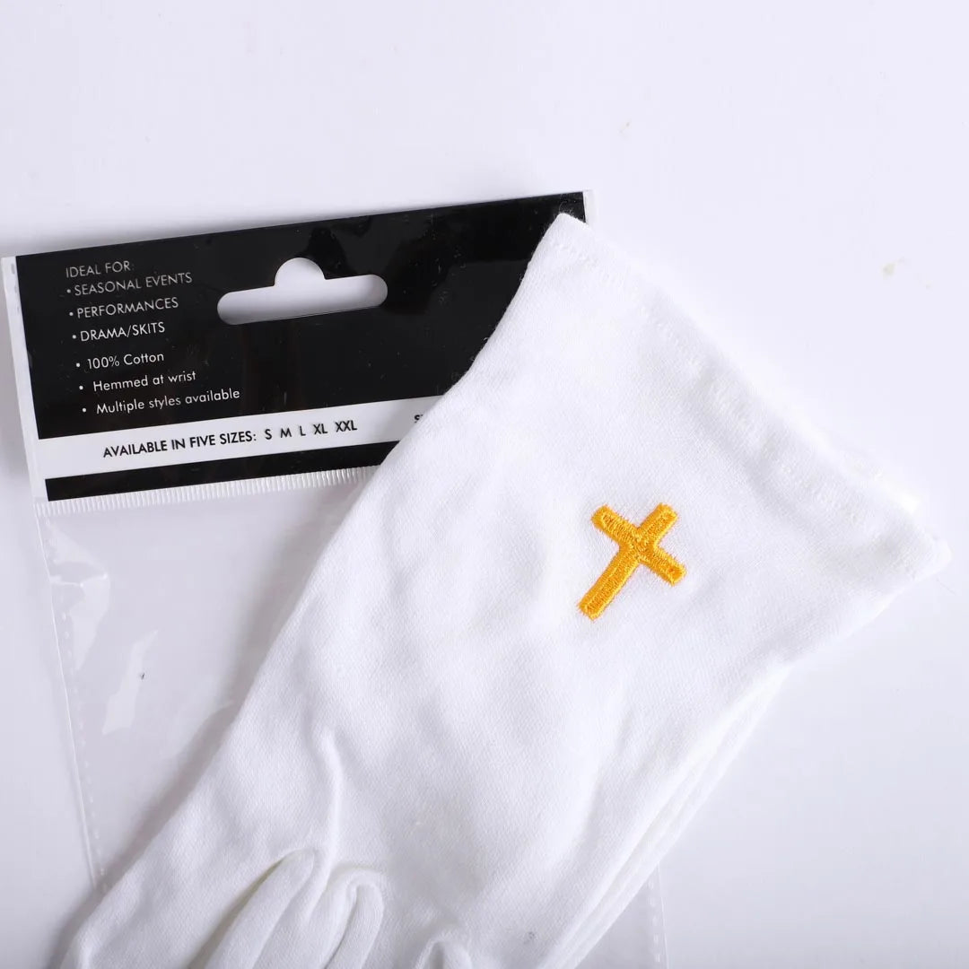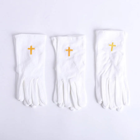 Made from 100% high-quality cotton, these gloves are lightweight and breathable, ensuring comfort even during warm-weather events. The soft, durable fabric offers a snug yet flexible fit, allowing for ease of movement while maintaining a neat, professional look. The gold embroidered cross provides a subtle yet meaningful detail, making these gloves particularly suitable for religious services, weddings, and other formal gatherings.