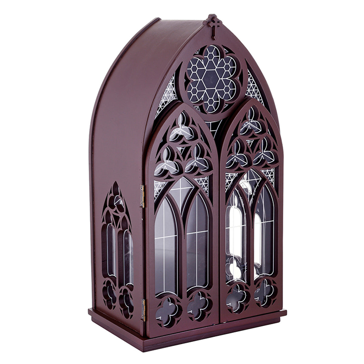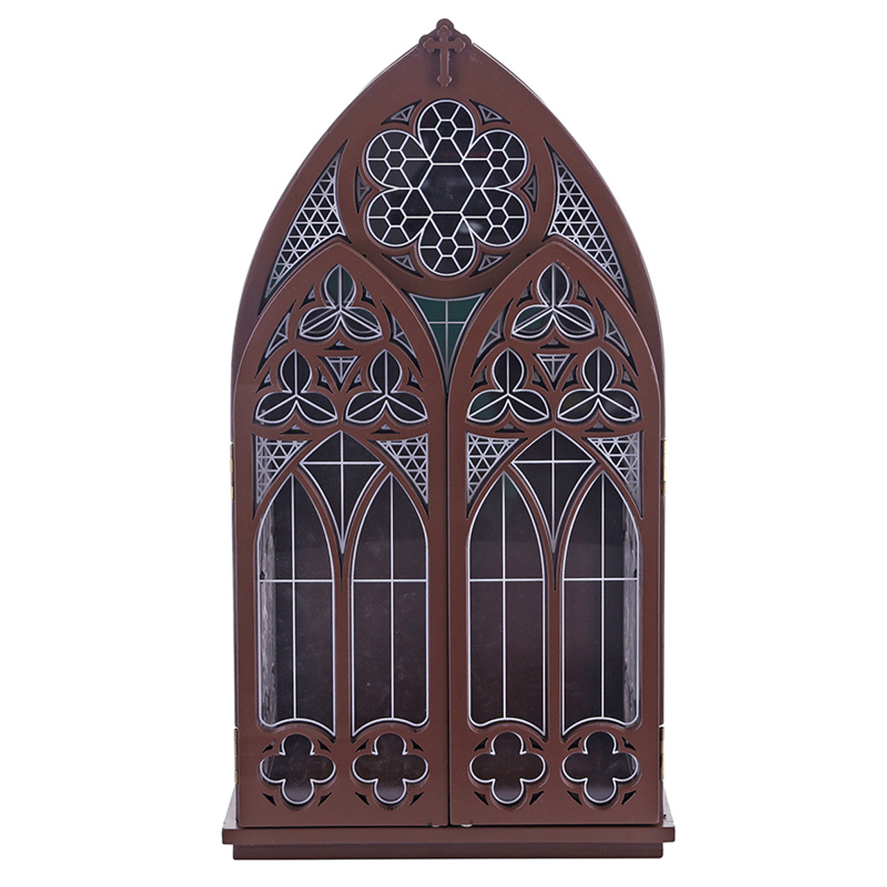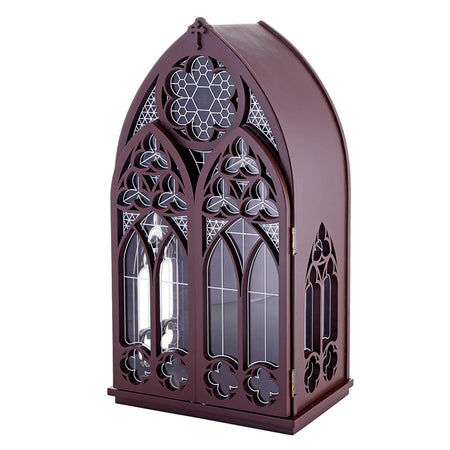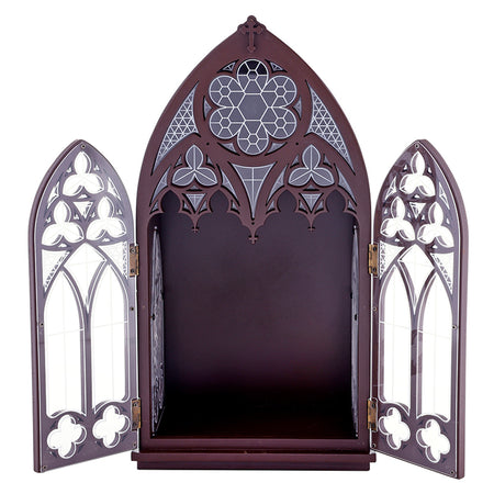 Robert Smith 17-1/2"H Gothic-style reliquary cabinet has an ornate, Old World architectural design reminiscent of Great European churches, and is ideal for storing and displaying your reliquaries and Sacred Relics in your chapel, church or home devotional area. Crafted from hardwood with a dark walnut finish. Push-to-open latch system keeps two front doors securely closed. Cabinet can be wall-mounted, or used as a tabletop appointment.