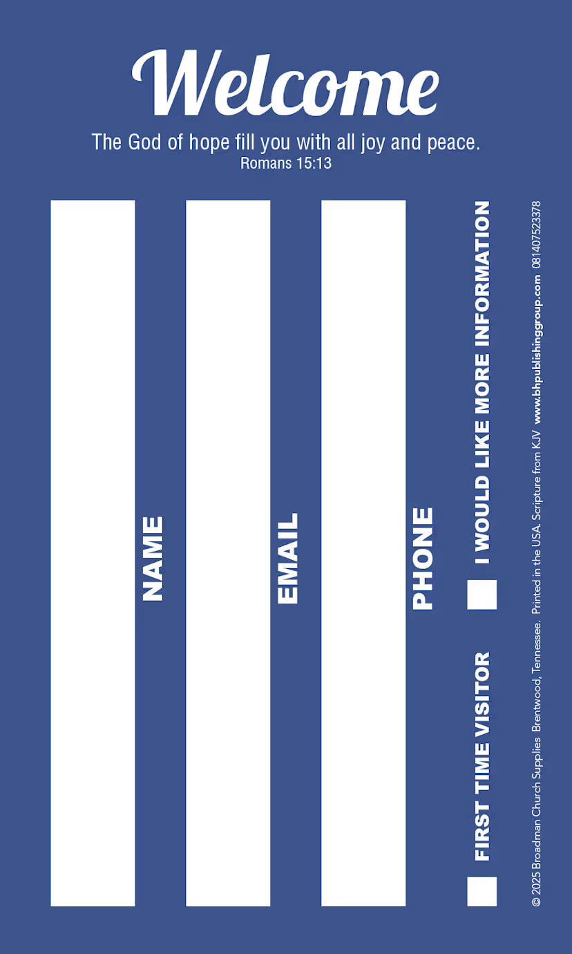 The Guest Welcome Cards express a warm welcome to guests, are designed with plenty of space for guests to share basic contact information and are printed on quality card stock. Guest Welcome Cards measure 3" x 5" and are shrink wrapped in a package of 50 cards. Also available, matching Prayer Request Card and Greeter/Usher Name Tags.