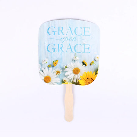 Stay cool and refreshed with our beautifully designed traditional hand fans, the perfect accessory for any occasion. Crafted from durable cardstock, these fans are built to withstand use while offering a charming and functional design. Featuring a soft blue and floral pattern, the fans display the inspiring message “Grace Upon Grace,” combining beauty with a reminder of God’s endless grace.