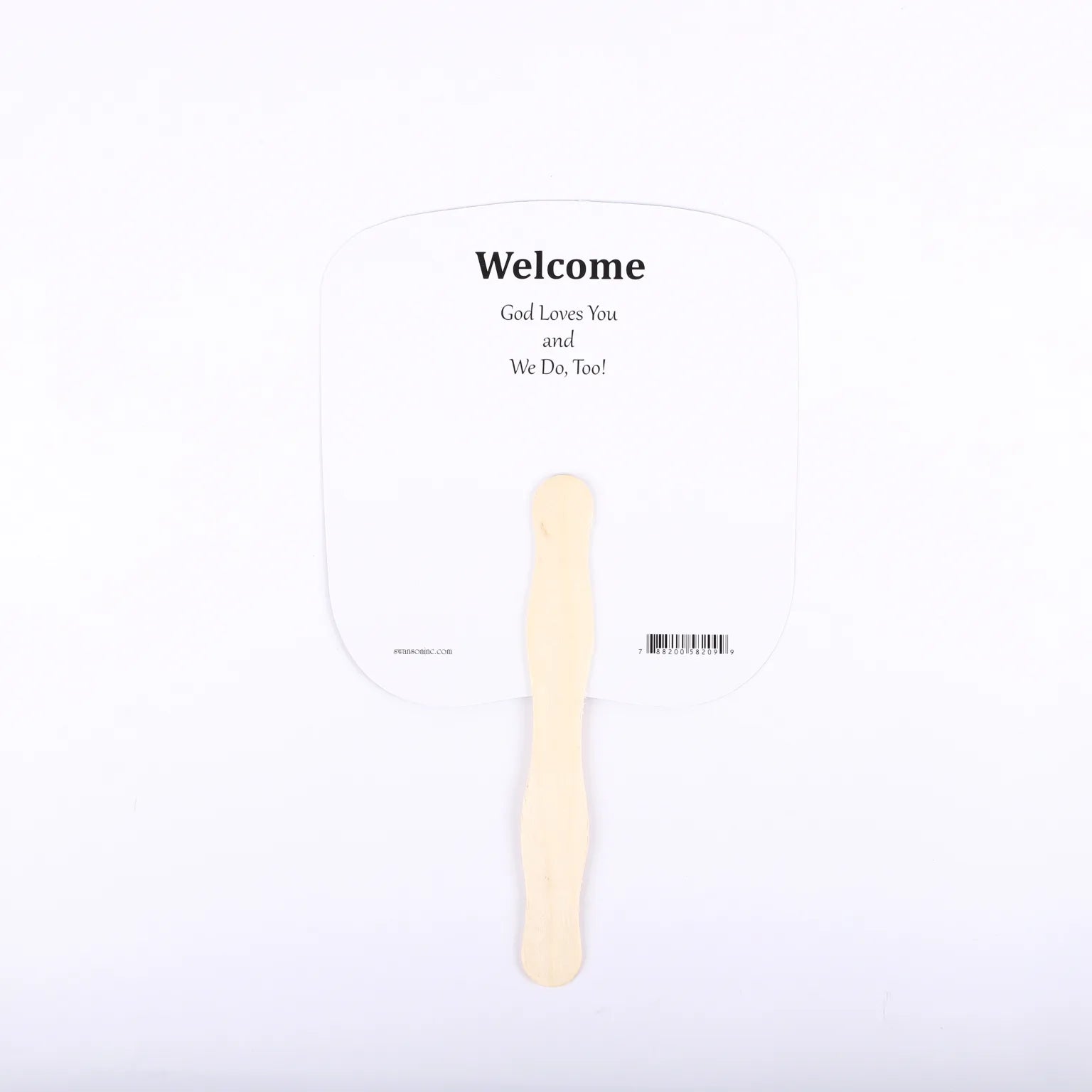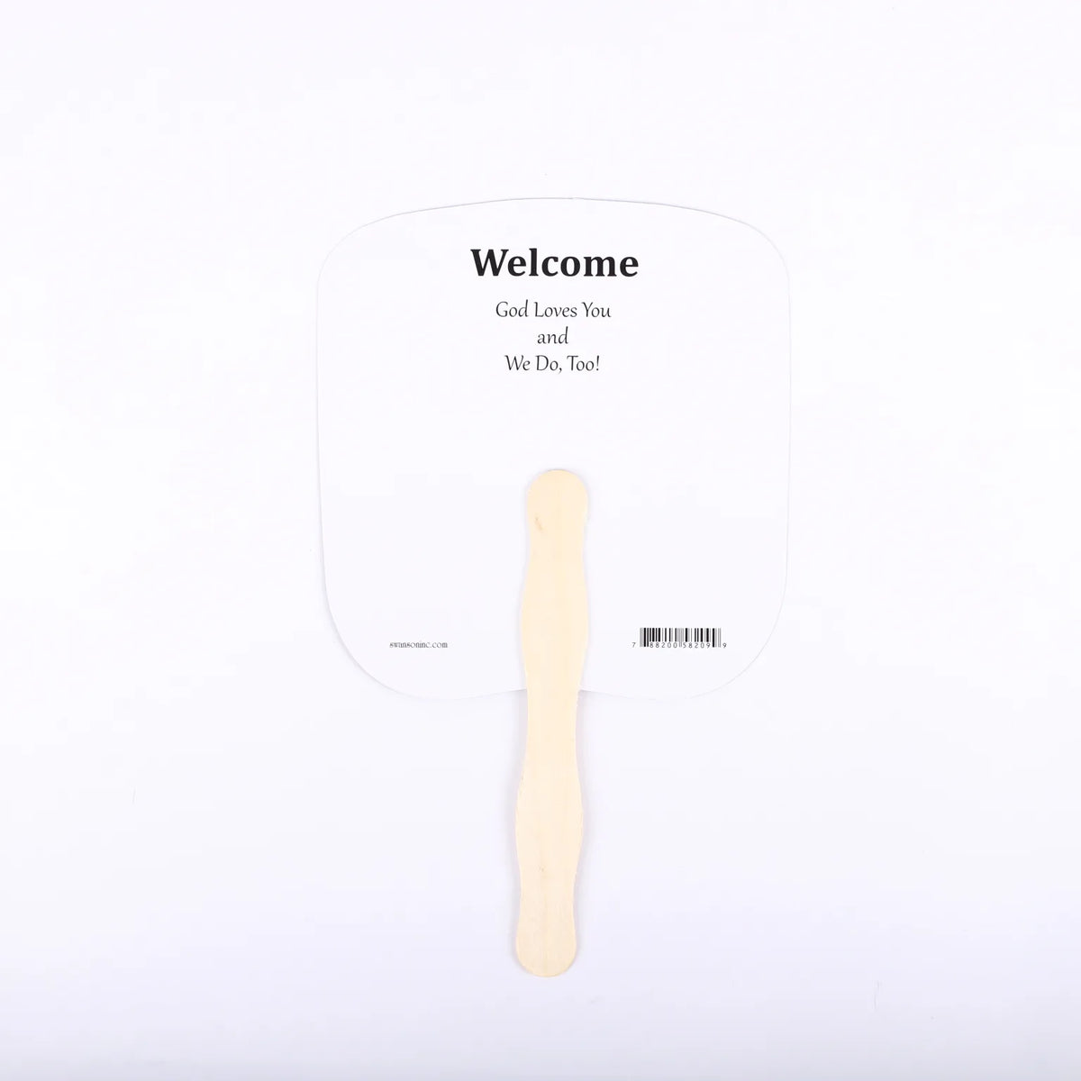 On the back, the fan includes a simple and uplifting black-and-white design that reads, “Welcome, God Loves You & We Do Too!” This thoughtful message adds a touch of warmth and encouragement to your day. The smooth wooden handle, measuring approximately 4 inches tall, ensures a comfortable and easy grip.