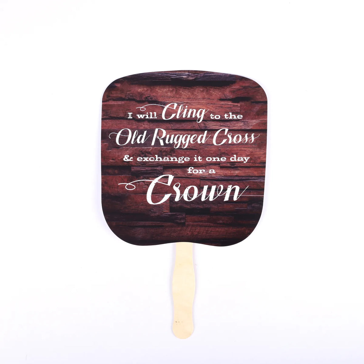 Our beautifully designed traditional hand fans are the perfect accessory to keep you cool during any event or gathering. Made from durable cardstock, these fans are built to last and feature a full-color printed design on the front. The stunning design showcases a natural wooden background along with an inspiring message from the beloved hymn “The Old Rugged Cross.” These fans offer a modern take on a traditional accessory, making them ideal for any occasion.