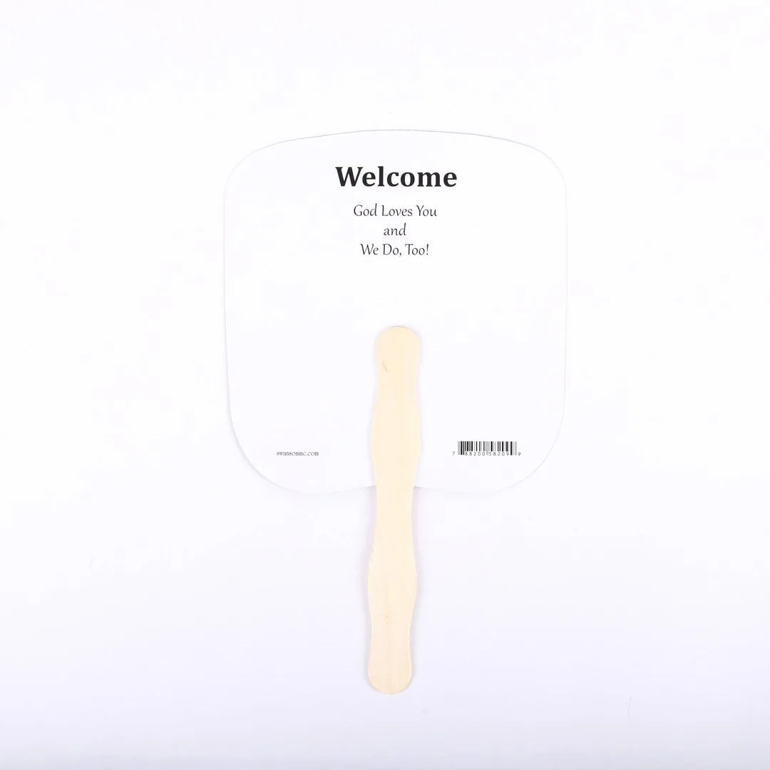 On the back, you’ll find a heartfelt, black-and-white design that reads, “Welcome, God Loves You & We Do Too!” This thoughtful message adds a personal touch, making these hand fans perfect for church events, weddings, outreach services, and other special gatherings. The fans are finished with a smooth wooden handle that measures approximately 4 inches tall, providing a comfortable grip for easy handling.