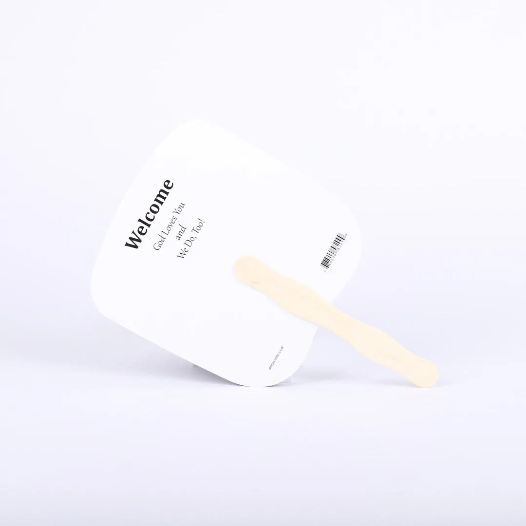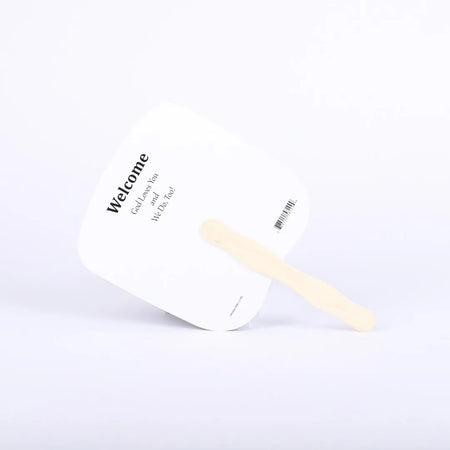 The back of the fan features a simple black-and-white “Welcome, God Loves You & We Do Too!” message, creating a warm, welcoming vibe at any event. The fan also includes a smooth wooden handle, approximately 4 inches tall, providing a comfortable and durable grip for easy handling.