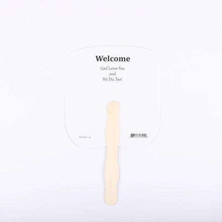 The back of the fan features a simple black-and-white “Welcome, God Loves You & We Do Too!” message, offering a welcoming and uplifting sentiment. The fan also includes a smooth wooden handle that measures approximately 4 inches tall for a comfortable grip. The fan’s design measures approximately 7.5″ x 8″, making it the perfect size to carry around and keep you cool on hot summer days.