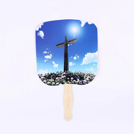 Our beautifully designed traditional hand fans are the perfect accessory to keep you cool during any event. Made of durable cardstock, these fans are built to last and feature a full-color printed design on the front. Featuring imagery of a cross on a hill of flowers, these fans provide a modern take on traditional hand fans and are perfect for church services and events. The design serves as a powerful reminder of faith and the beauty of God’s creation.