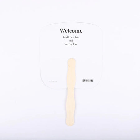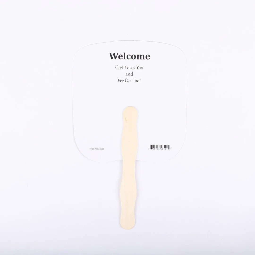 The back of the fan boasts a simple black-and-white “Welcome, God Loves You & We Do Too!” design, conveying a welcoming and positive message for all who use it. The fan also features a smooth wooden handle, approximately 4 inches tall, ensuring a comfortable and sturdy grip.