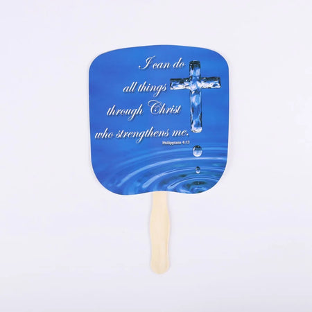 Our beautifully designed traditional hand fans are the perfect accessory to keep you cool during any event. Made of durable cardstock, these fans are built to last and feature a full-color printed design on the front. With the inspiring phrase “I can do all things” from Philippians 4:13, paired with soothing imagery of living water, these fans create a serene and uplifting message that is sure to inspire at any occasion or event. The soft blue tones complement the design, offering both tranquility and motivation.