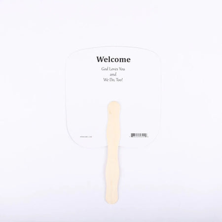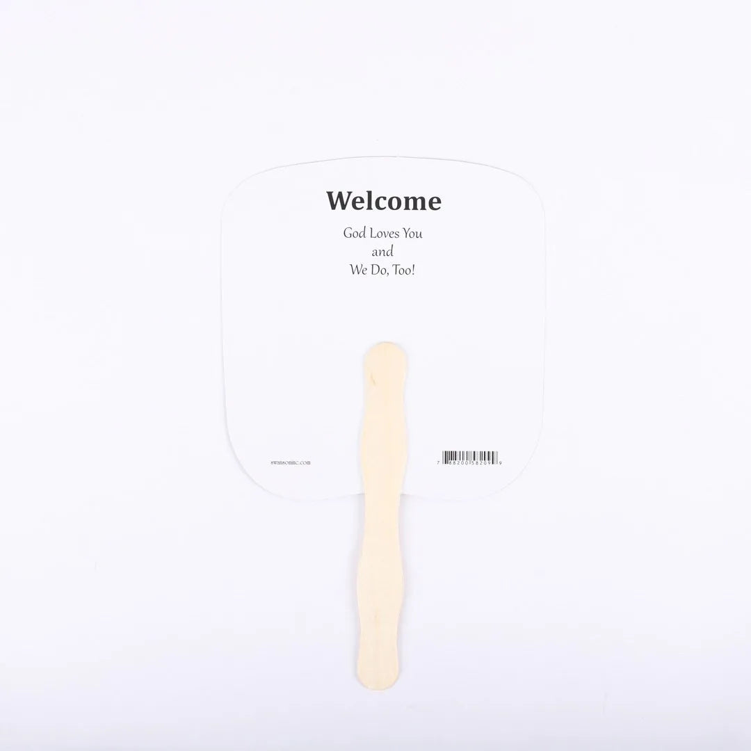 The back of the fan features a simple black-and-white “Welcome, God Loves You & We Do Too!” design, spreading a positive message to all who use it. The fan is also equipped with a smooth wooden handle, approximately 4 inches tall, ensuring comfort and durability.