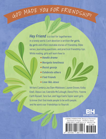 Hey Friend: 31 Journaling Devotions on Friendship helps girls know that God made them for friendship. They don’t have to live life alone. Each devotion is written by young women for young women and offers relatable stories of friendship, passages of Scripture, journaling questions, and practical ways to find friends instead of staying isolated. Friendships end, begin, and change all the time, and Hey Friend is every girl's guide to learning how to navigate friendship in changing seasons from switching schools to going off to college to needing to walk away from certain friendships and invest in others.