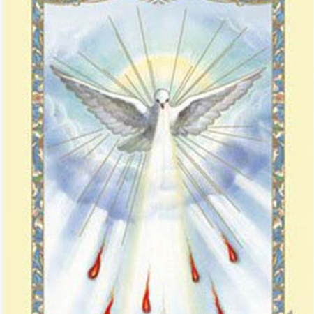 - Front: Classic portrayal of the Holy Spirit as a descending dove, highlighted with gold-foil detail
