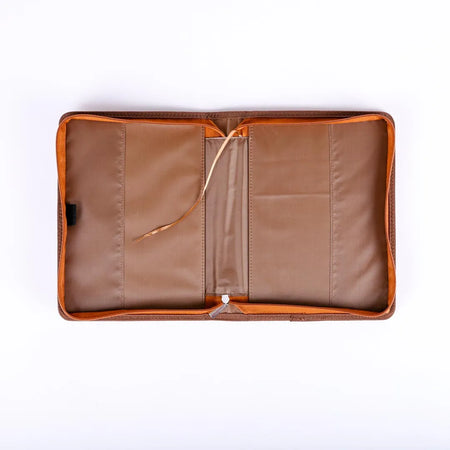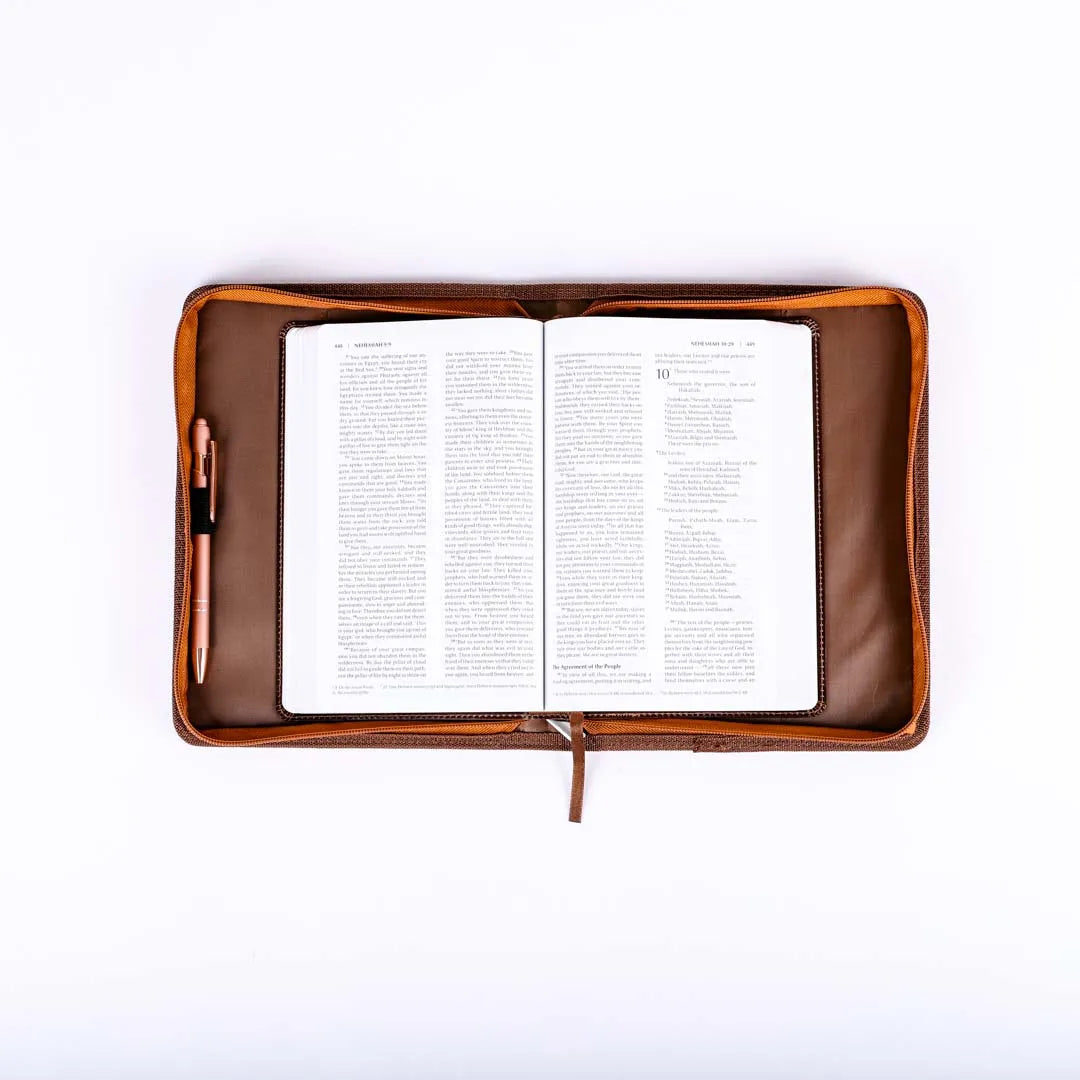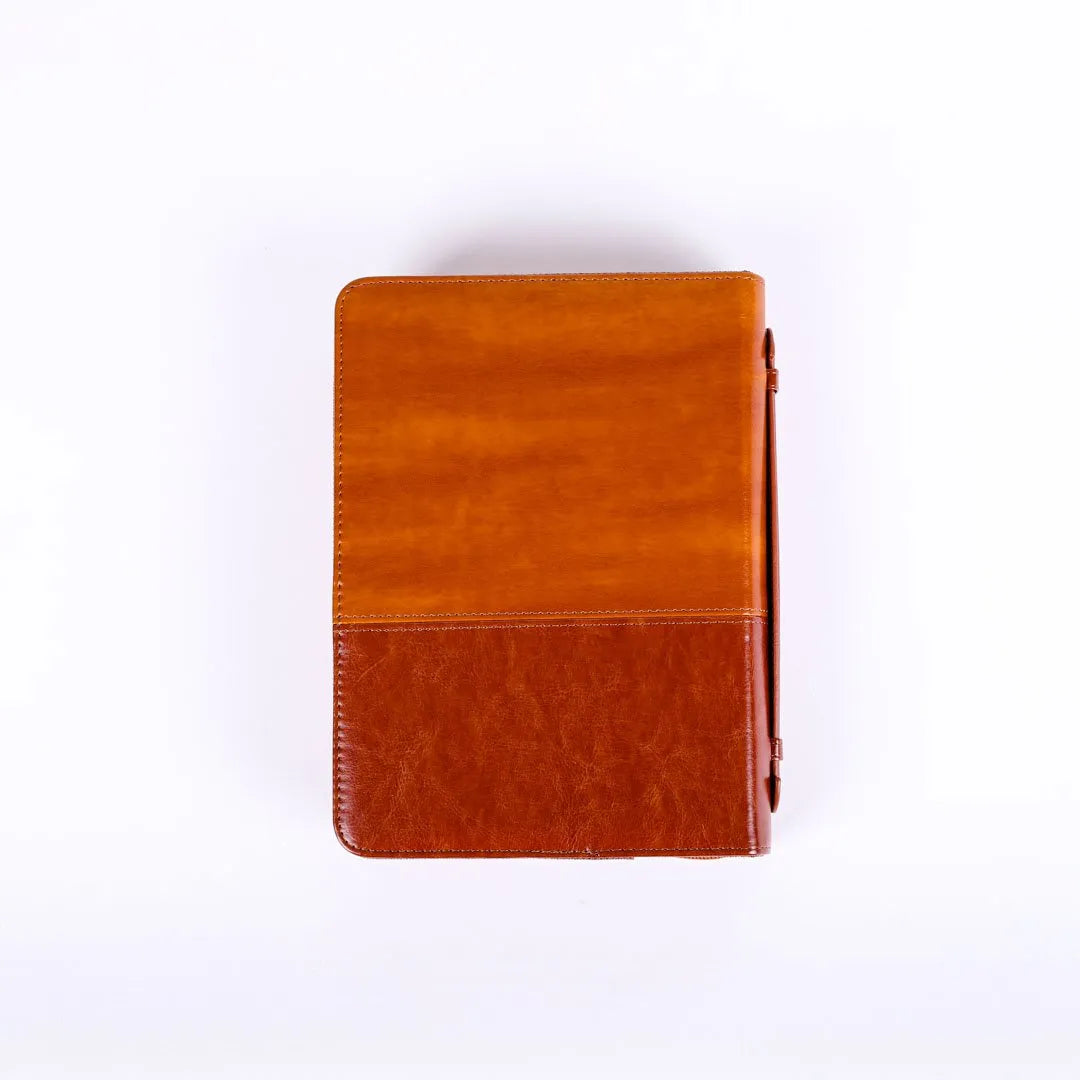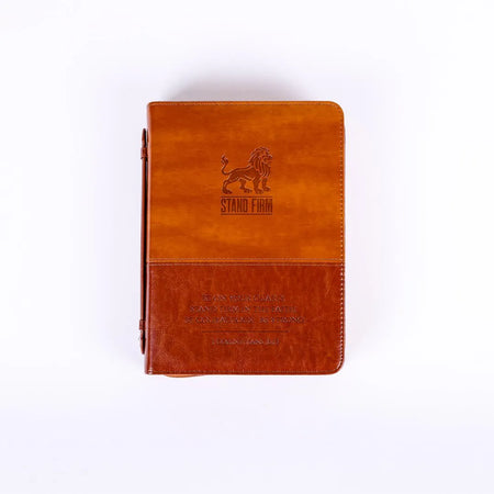Protect your bible in a sturdy and stylish way with this Imitation Leather Bible Cover. Features a stamped “Stand Firm” design on 2 tone Brown. Created to withstand daily wear and tear, and it’s easy and simple to wipe clean. Features a Carry Handle, Fish Engraved Zipper Pull, Handle for easy carrying and travel, Loop for storing your pen, and Ribbon Bookmark to aid in studying. Size Large. Appx. 7.5″ x 10″ x 2″