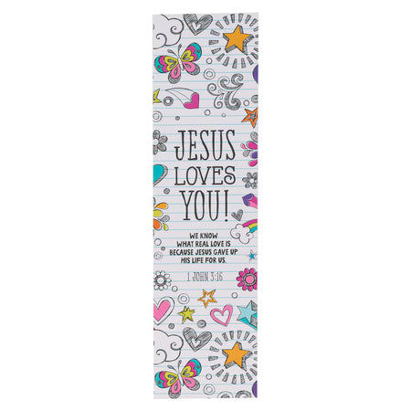 Capture your students' attention with a bookmark that features colorful and cheerful designs of hearts, rainbows, stars, and butterflies, and remind them that Jesus loves them no matter what. The powerful sentiment is presented in bold black lettering, making it easy for young readers to understand and embrace.