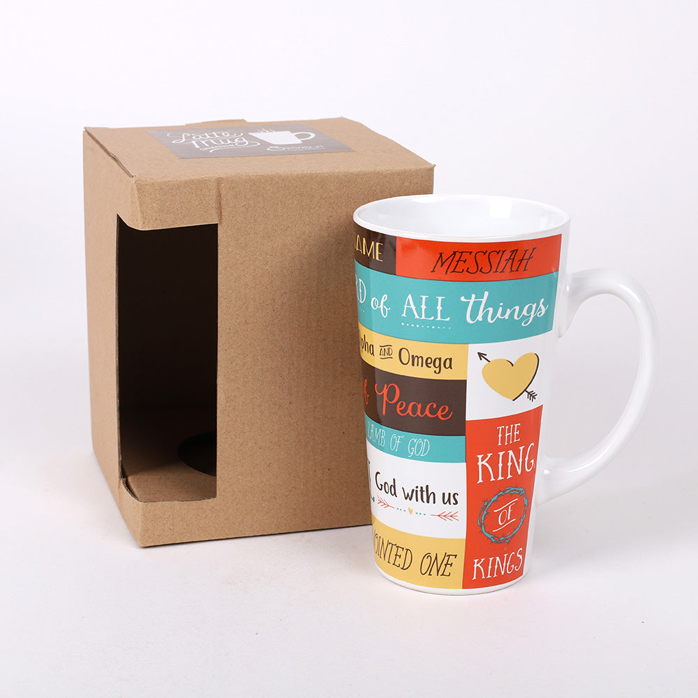 This is a sleek and stylish latte mug, perfect for enjoying your favorite hot beverage in the morning or relaxing with a warm drink in the evening. This mug features a curved handle for comfortable gripping and a generous 16 ounce capacity to hold your favorite coffee, tea, or hot chocolate. Made from high-quality stoneware, our latte mug is durable, microwave safe, and dishwasher safe for easy cleaning. Its names of Jesus color block design makes it a perfect addition to your collection, and its size fits perfectly under most coffee makers.