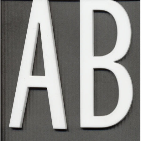 Custom cut white plexiglass with flexible magnetic backing. 1/8" thick x 4" high. One each of A-Z.