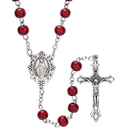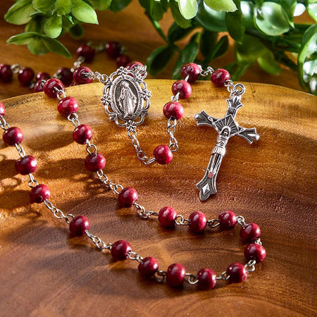 Maroon Round Bead Rosary | Wood with Antique Silver Accents | Pack of 12