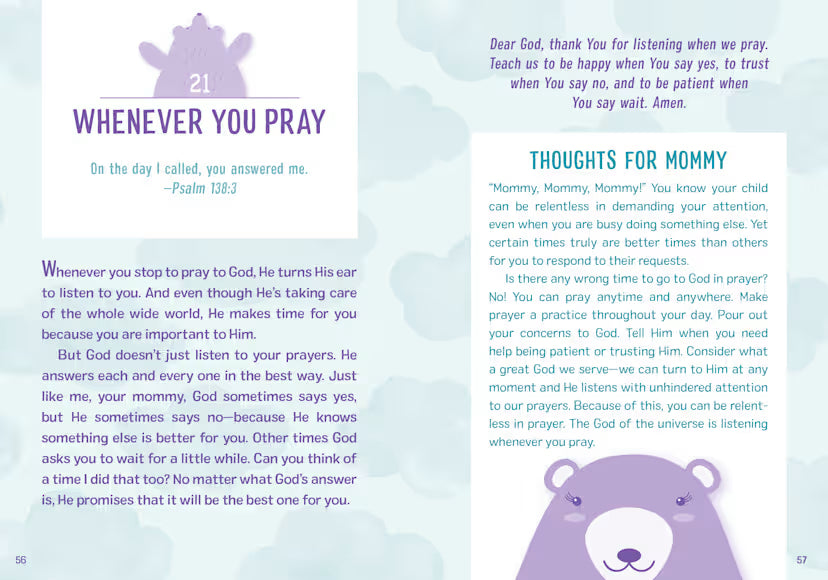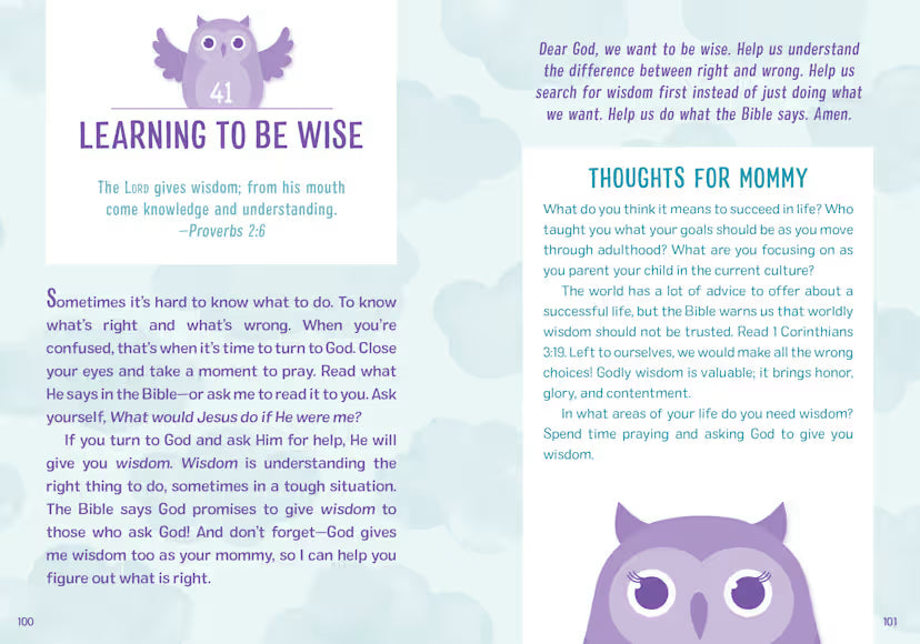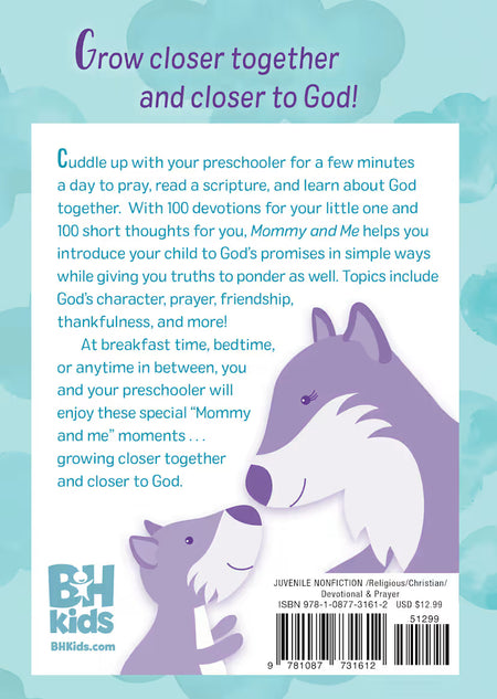 Mommy and Me Devotions provides 100 short devotions for Mom to read with her preschooler during breakfast, bedtime, or anytime in between! Find five minutes, cuddle up, and learn about God’s love, forgiveness, prayer, faith, emotions, patience, praising God, and more! These quick devotions are written with children ages 2-6 in mind and help mothers model the importance of devotional time and faith-building with their children. Each devotion includes a prayer to pray with the child. Finally, each parent-child devotion is followed by an extra devotion just for Mom to read by herself on the same topic. Let these short and shared devotional times feed your family’s faith and offer a welcome moment of togetherness.