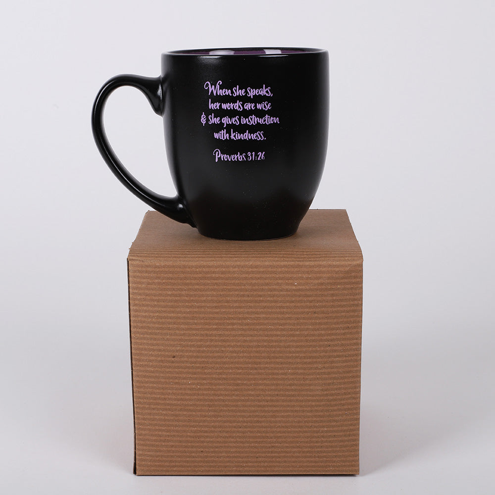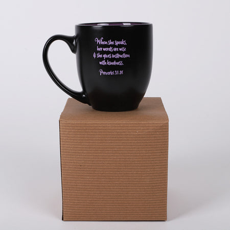 The front of the mug showcases the phrase “Woman of God” in a delicate light purple script, serving as a daily affirmation of faith. On the back of the mug, the uplifting words from Proverbs 31:26 serve as a reminder of wisdom and kindness: “She speaks with wisdom, and faithful instruction is on her tongue.”