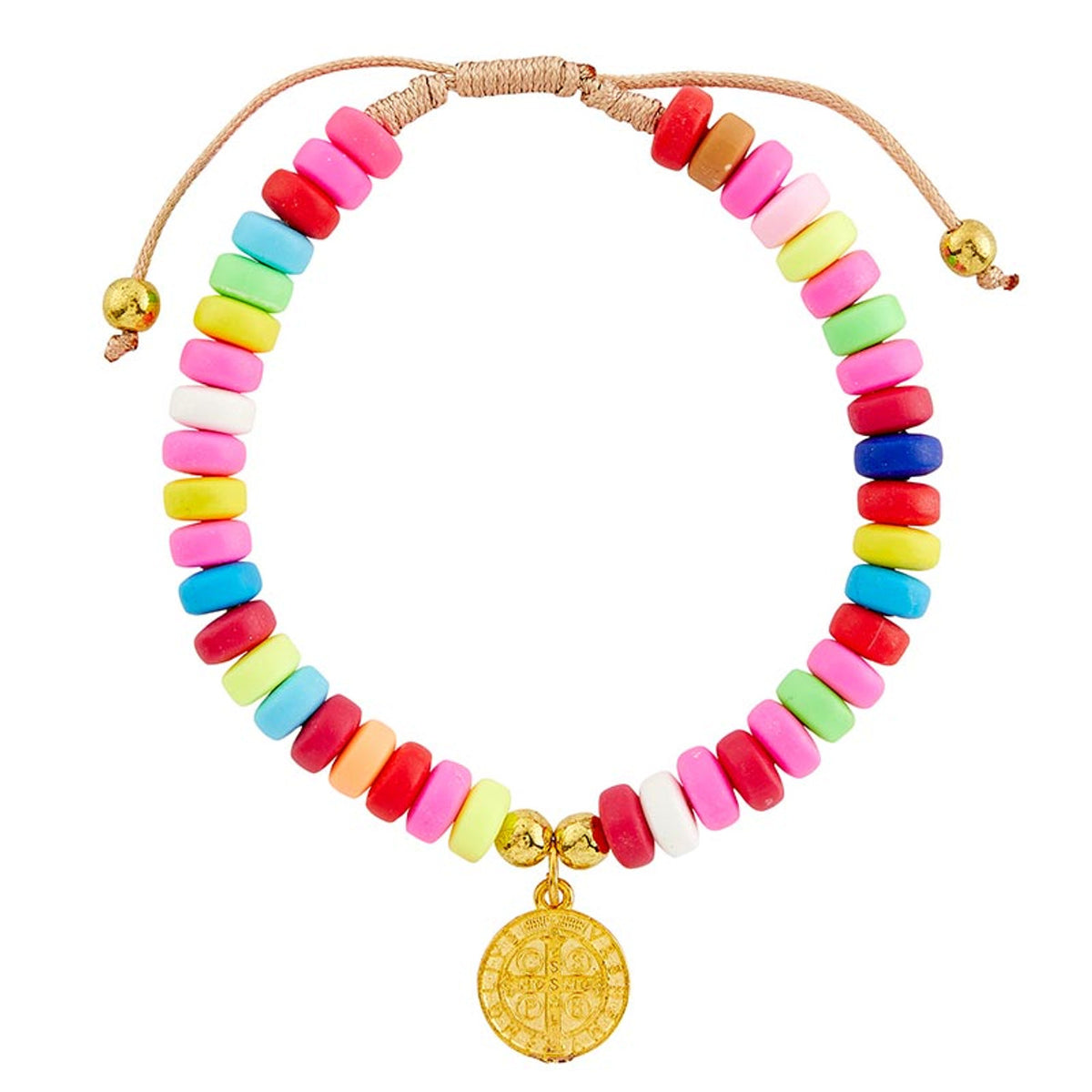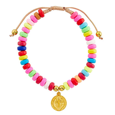 Bring a burst of color and spiritual vitality with the Multicolor Saint Benedict Bracelet. Featuring multicolor clay beads threaded on an adjustable cord and centered with a gold-plated Saint Benedict medal, this bracelet is both a fashion statement and a devotional tool.