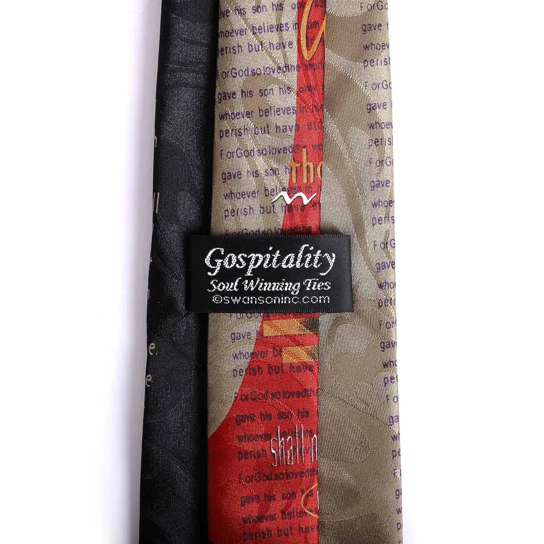 The tie features a deep black base color, highlighted with a striking John 3:16 pattern in rich shades of red and gold. This design adds a touch of elegance and spirituality, making it perfect for expressing your faith with style, whether for a formal event or a casual night out.