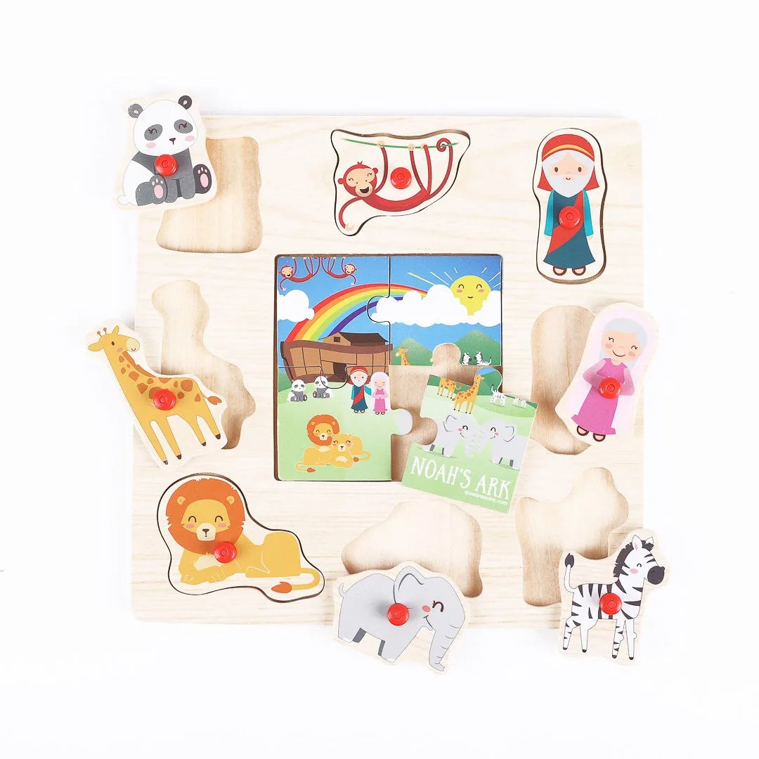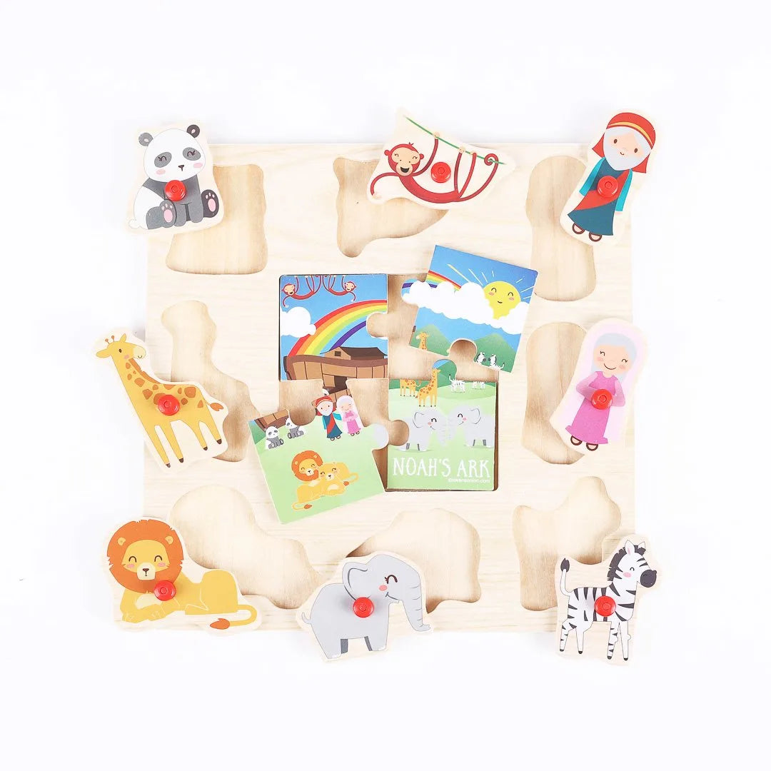 Teach your toddler and babies about the different animals and the story of Noah’s Ark in a colorful way that they will love! Inspire faith in God in your little ones or as a Birthday or Christmas gift with the story of Noah’s ark while encouraging creativity and hand-eye coordination. Made of smooth, sturdy wood with sanded and rounded edges, this puzzle is perfectly safe for babies, toddlers, and young children to play with. Each block features a colorful element from the beloved story of Noah’s Ark, making this puzzle both educational and engaging. Your child will love matching the animals and pieces together, building their cognitive functions and improving their hand-eye coordination.