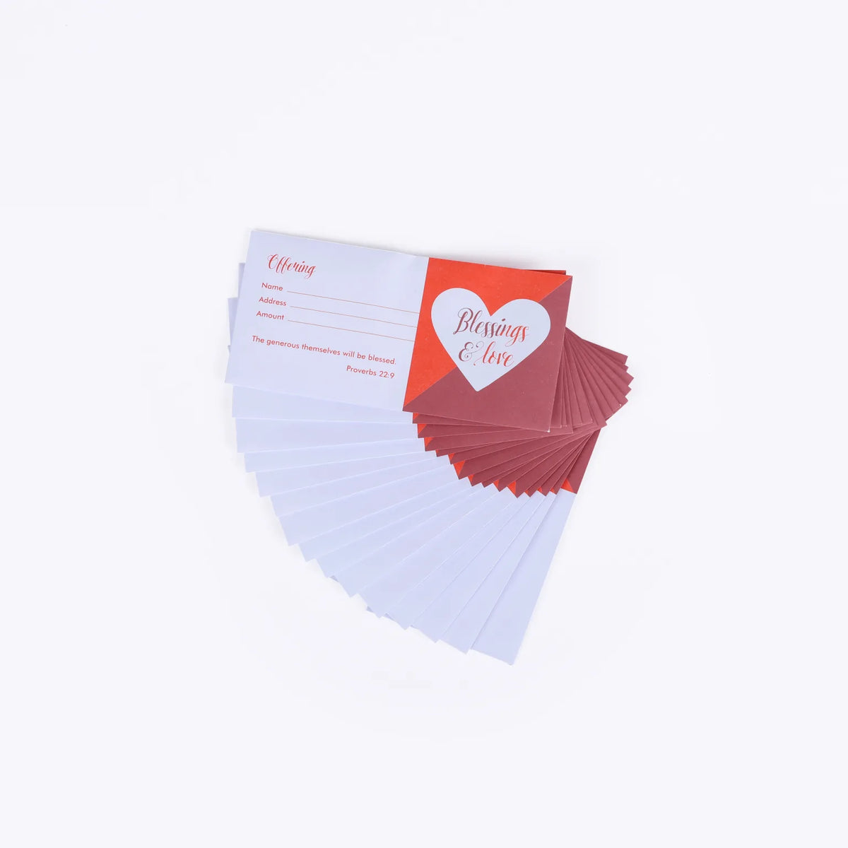 The front design of the envelope, titled “Blessings & Love,” features a simple yet elegant red design with a heart and Proverbs 22:9, conveying a message of love and giving. It also includes write-in slots for the name, address, and amount, making it easy for donors to provide all the necessary information for proper record-keeping.
