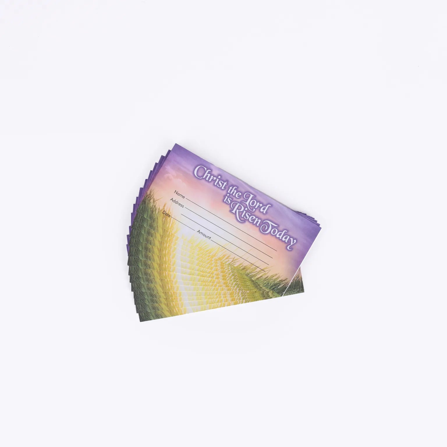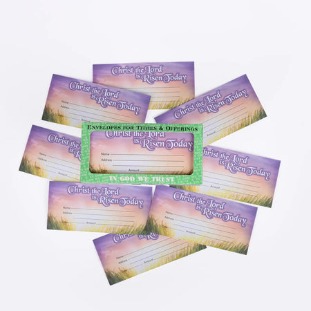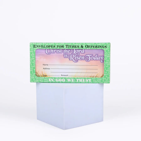 The front of the envelope features a full-color design with the phrase “Christ the Lord is Risen Today,” celebrating the resurrection of Christ, accompanied by an Easter-themed illustration of a beautiful sunset. This theme adds a meaningful touch to the donation process during the Easter season. The design also includes designated spaces for congregants to record their name, address, date, and the donation amount, ensuring that all contributions are properly documented.
