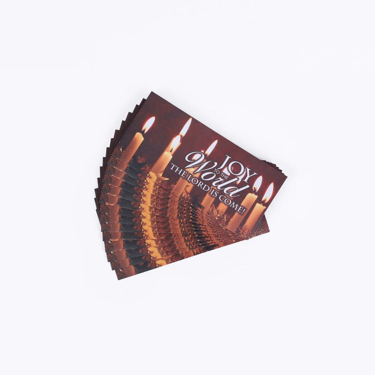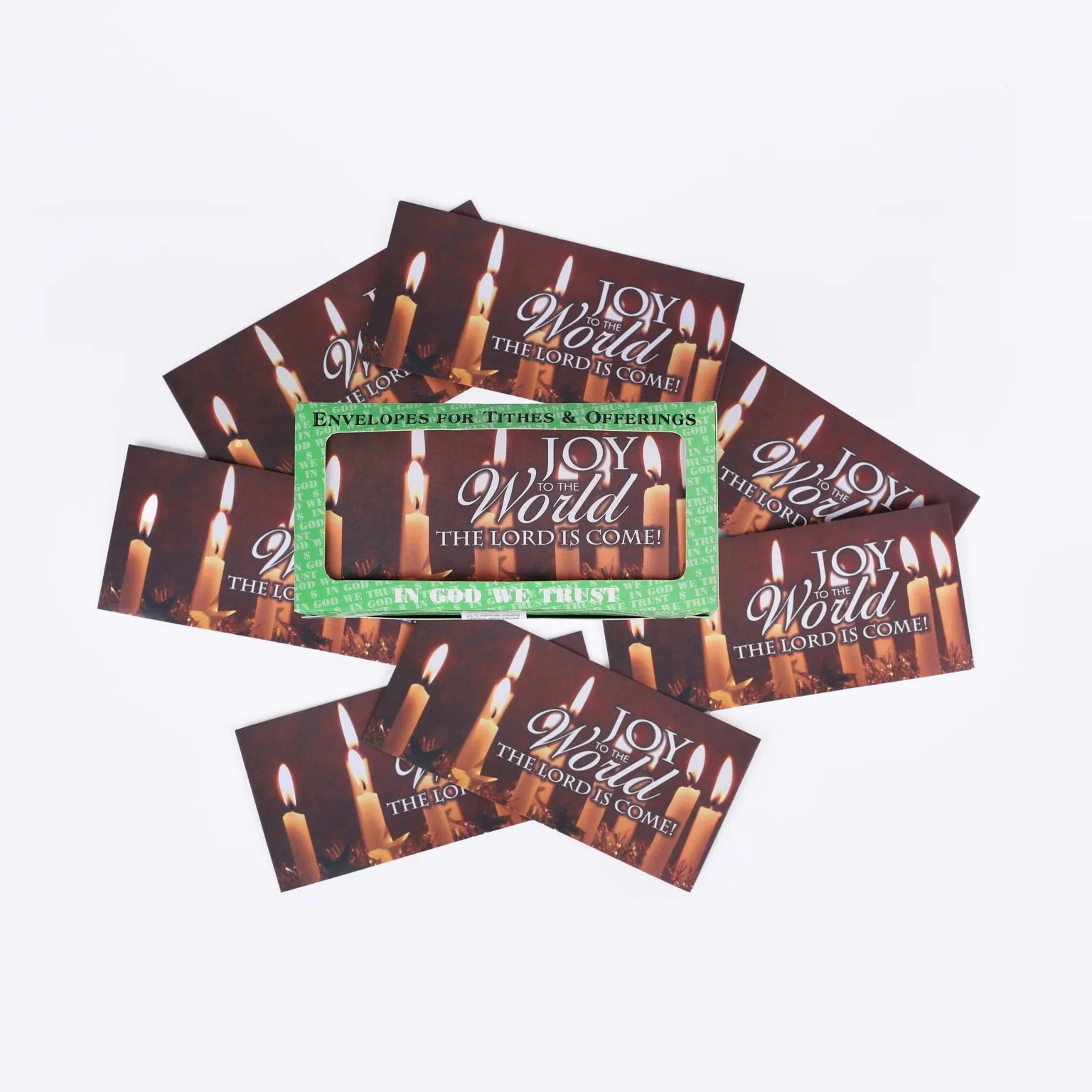 The front design is titled “Joy to the World” and features a full-color, festive Christmas candle scene, bringing a seasonal touch to your church’s donation collection. This design is both inviting and thoughtful, making it a fitting choice for special holiday offerings. On the back, the envelope is plain white, with a sealable flap and optional sections for phone and email, allowing for flexible use and customization.