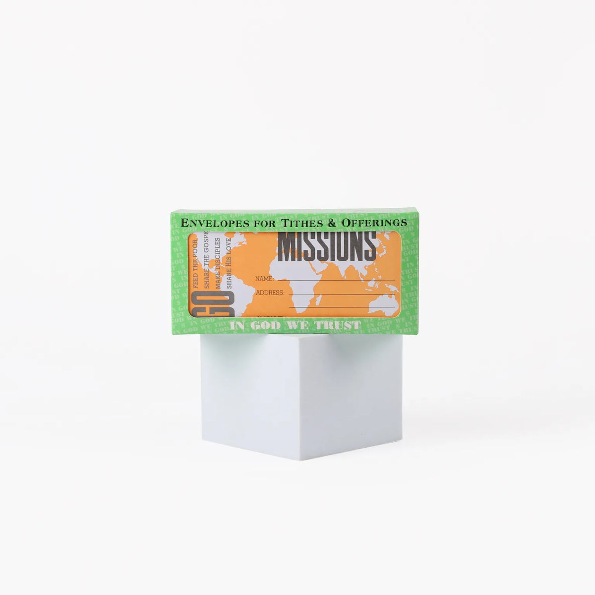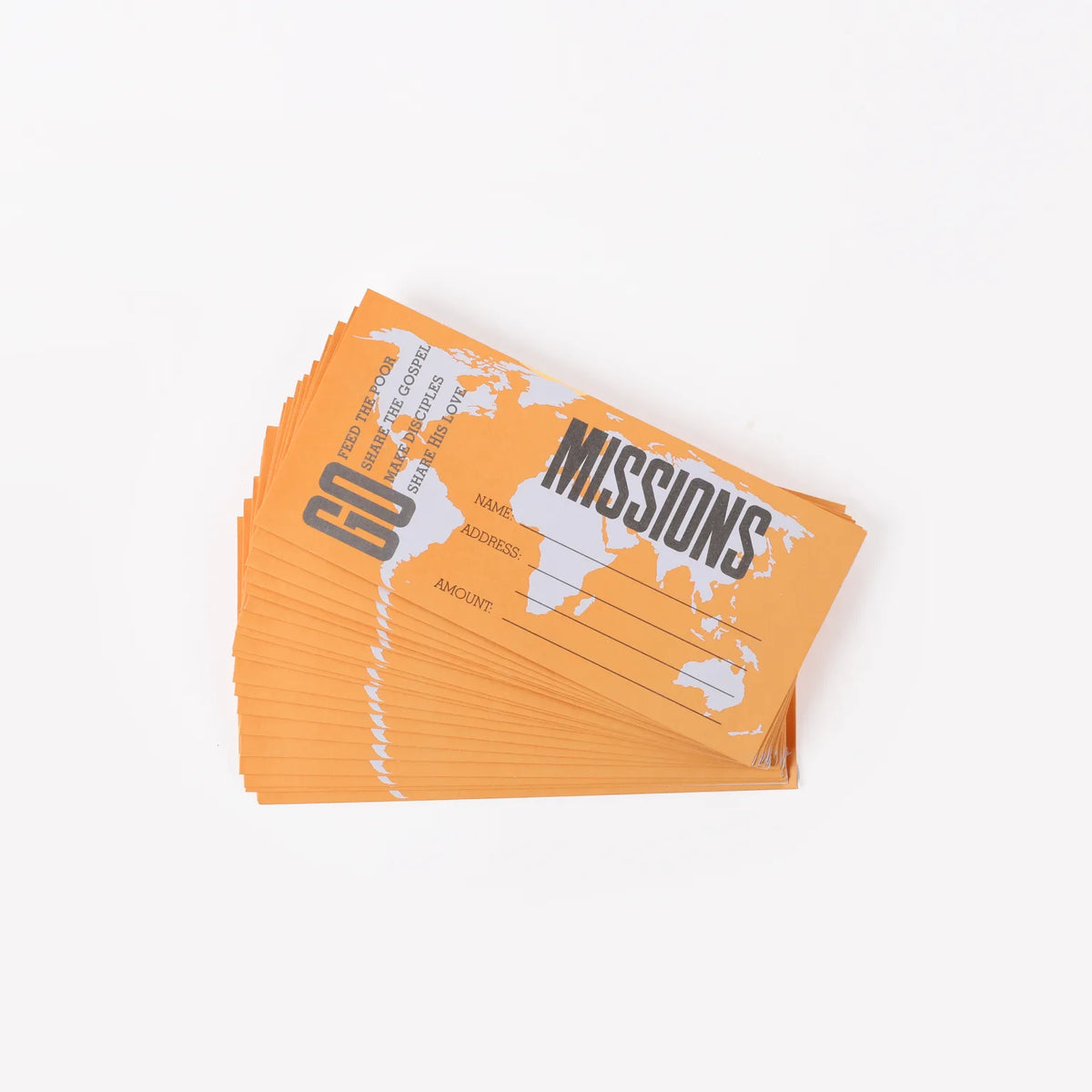 The front design is titled “Missions” and features a world map in vibrant orange and white colors. This design highlights the importance of global outreach and missions work, making it a perfect choice for collecting donations for mission efforts. The envelope includes write-in slots for name, address, and amount, ensuring that all necessary information is captured.