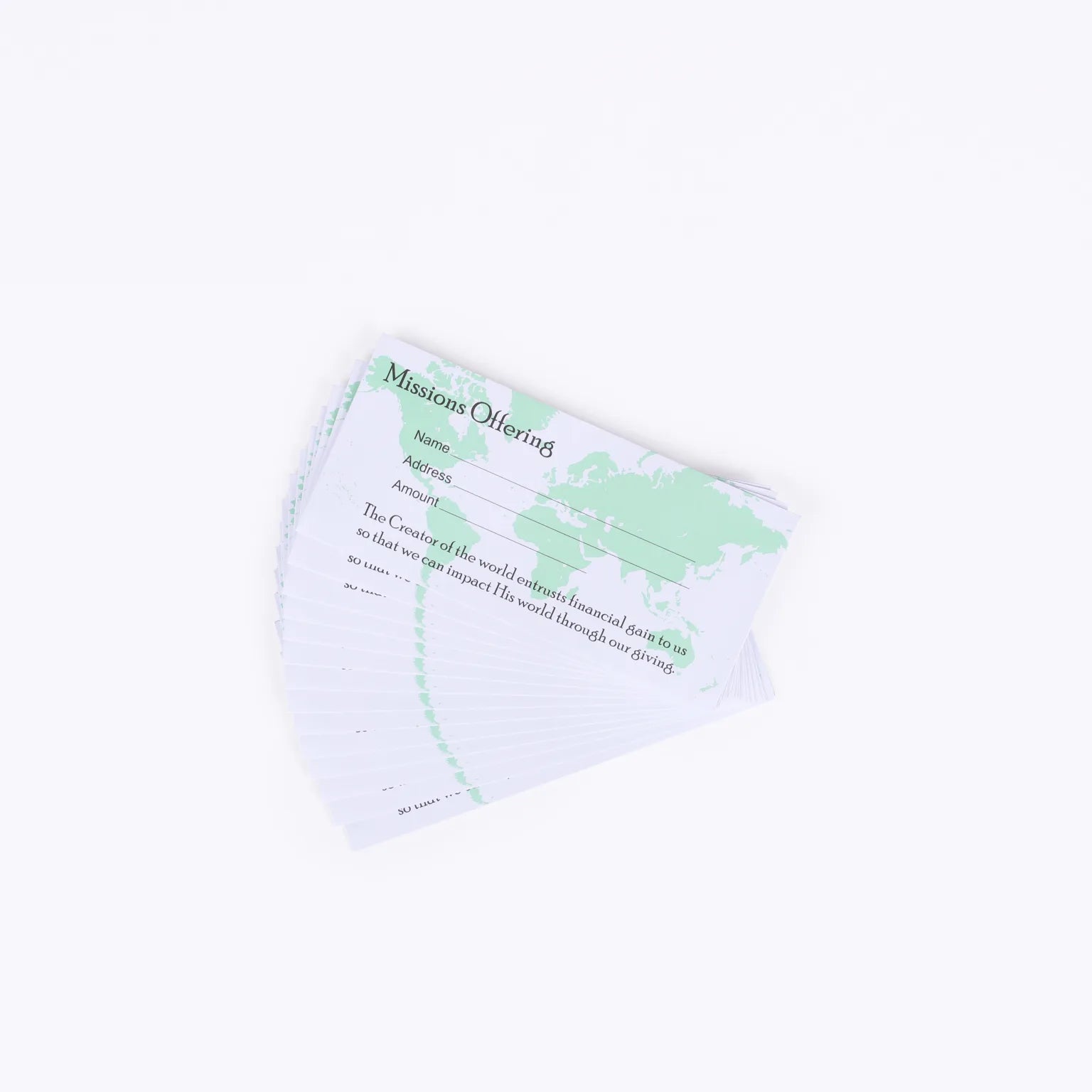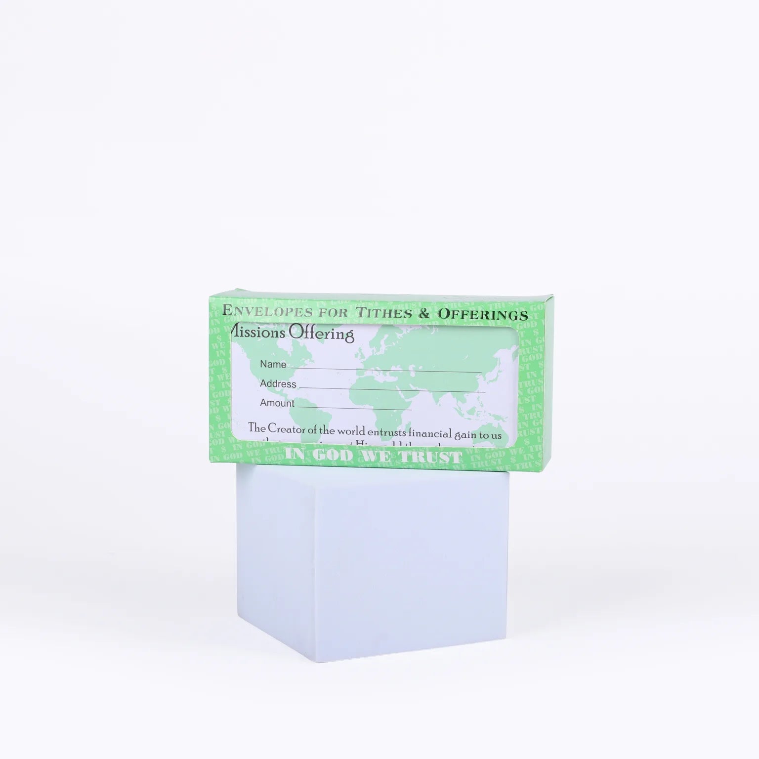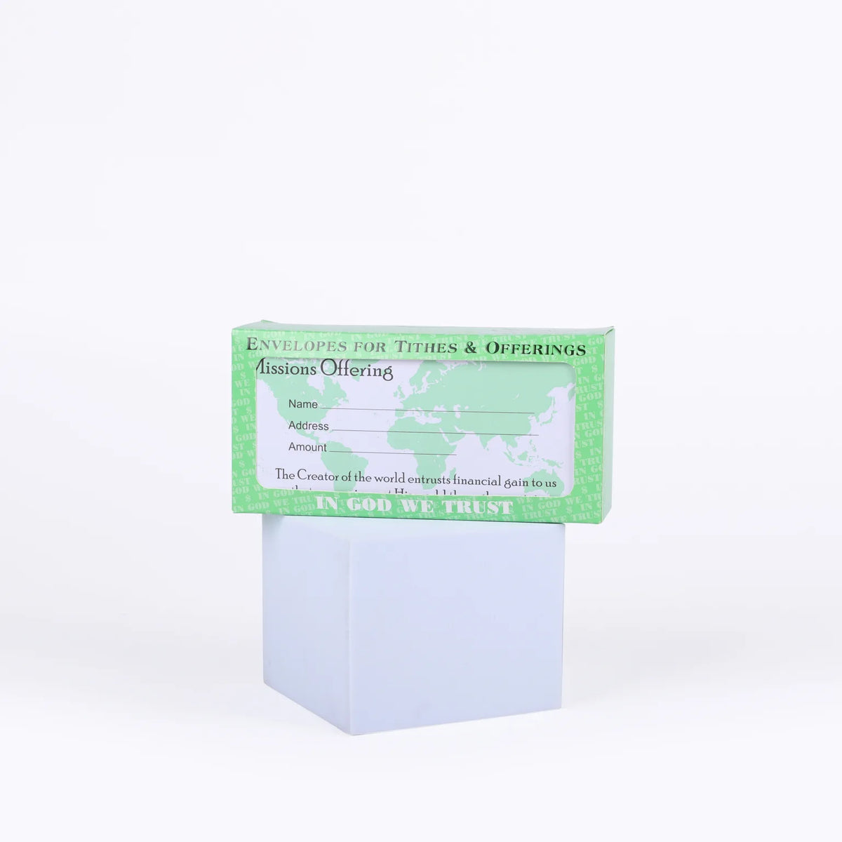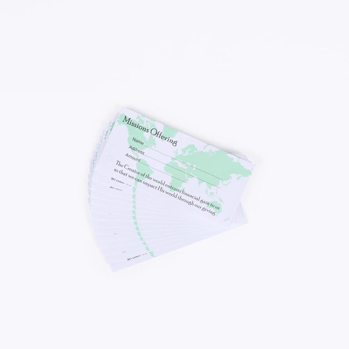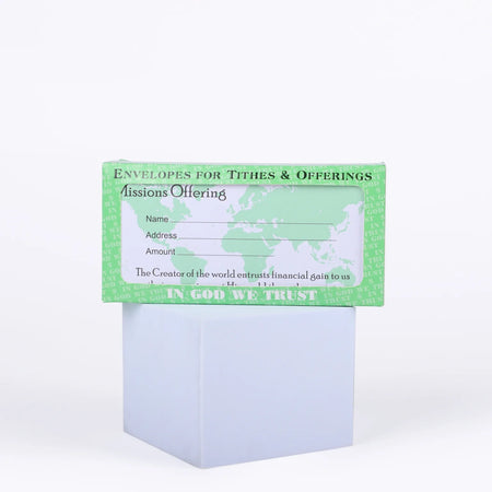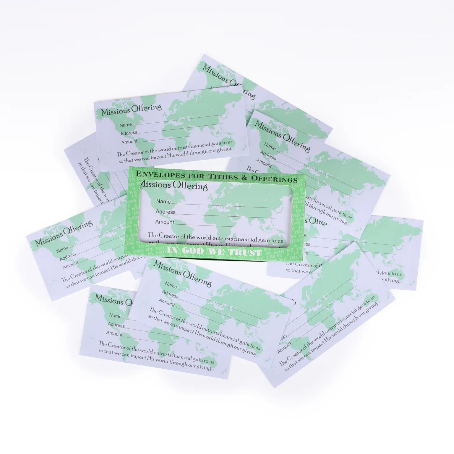 Missions tithes and offering envelopes are ideal for church members that like to pay with cash and checks to keep track. There is a field for name, address, and amount, as well as a checkbox for monthly or weekly on each card. The envelope says, “The creator of the world entrusts financial gain to us so that we can impact the His world through our giving.