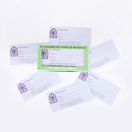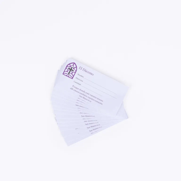 The front of the envelope features the title “El Diezmo,” alongside a design inspired by Matthew 6:21, which serves as a spiritual reminder of the importance of generosity. Write-in slots allow donors to personalize their contributions with ease. The back of the envelope is plain white and includes a sealable flap to ensure the security and confidentiality of the contents. Optional fields for phone and email provide additional flexibility for those who wish to share contact information.