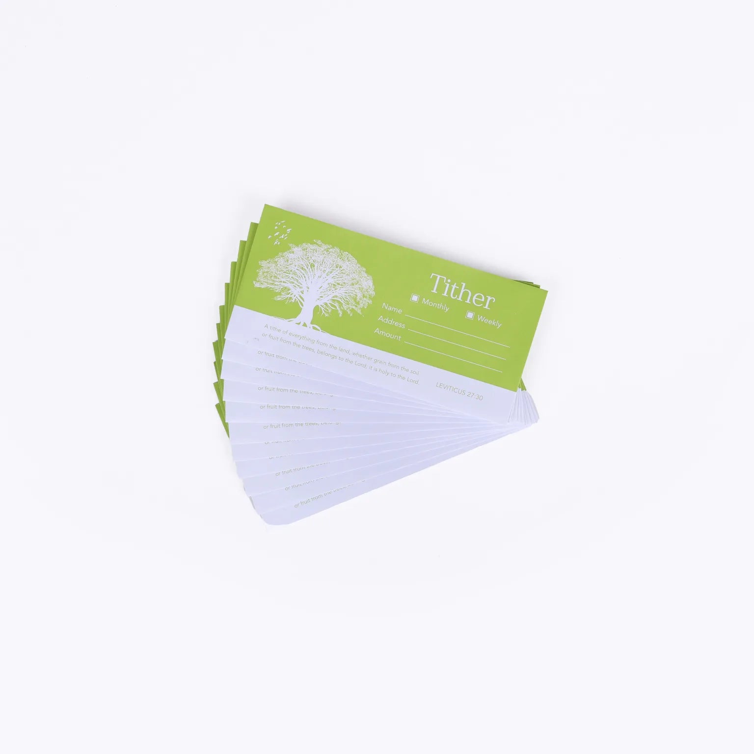 Front Design: “Tither”. A green and white design, featuring a tree and Leviticus 27:30, plus write-in slots for name, address, and amount.