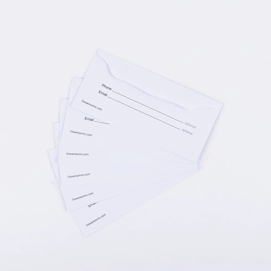 Back Design: Plain white with sealable flap, and optional sections for phone and email.