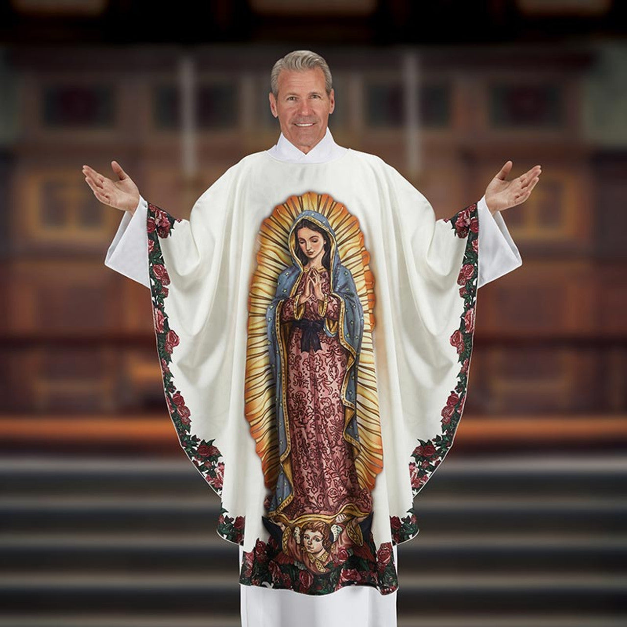 This Our Lady of Guadalupe Printed Chasuble from R.J. Toomey™ features exclusive artwork of Our Lady of Guadalupe from customer favorite artist Michael Adams. Each chasuble is digitally printed to achieve maximum detail and colors options. Perfect for feast days and other special celebrations. Includes a matching inner stole