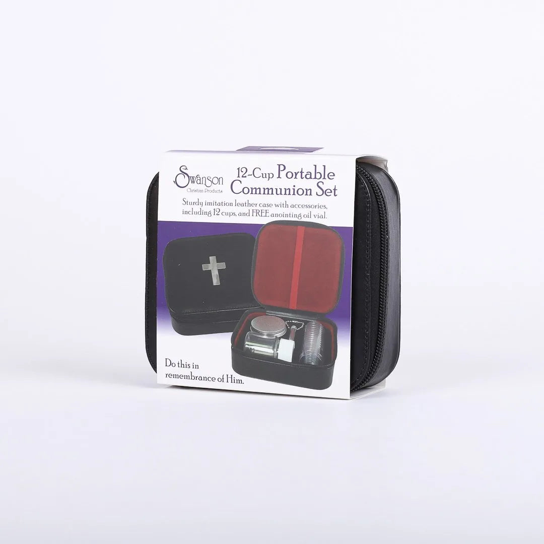 This kit includes 12 reusable communion cups, a 2oz. bottle for carrying juice, an aluminum tin for communion bread, and a metal anointing oil vial.