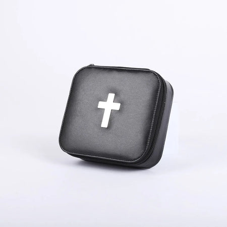 Whether you are traveling or want your own communion kit at home, this is the perfect portable set for whatever you need. Features a red velour interior and an imitation leather outer shell, complete with a silver cross decoration and a sturdy zipper to zip the case open and closed.