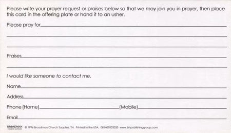 The Prayer Request Pew Cards measure 2 7/8" x 5" and are printed in 4-color on quality card stock to gather information such as who to pray for, praises, and contact information for the submitter. Philippians 4:6 (KJV) Scripture on the front. Shrink-wrapped in package of 50 cards.