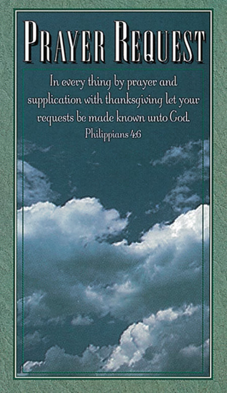The Prayer Request Pew Cards measure 2 7/8" x 5" and are printed in 4-color on quality card stock to gather information such as who to pray for, praises, and contact information for the submitter. Philippians 4:6 (KJV) Scripture on the front. Shrink-wrapped in package of 50 cards.